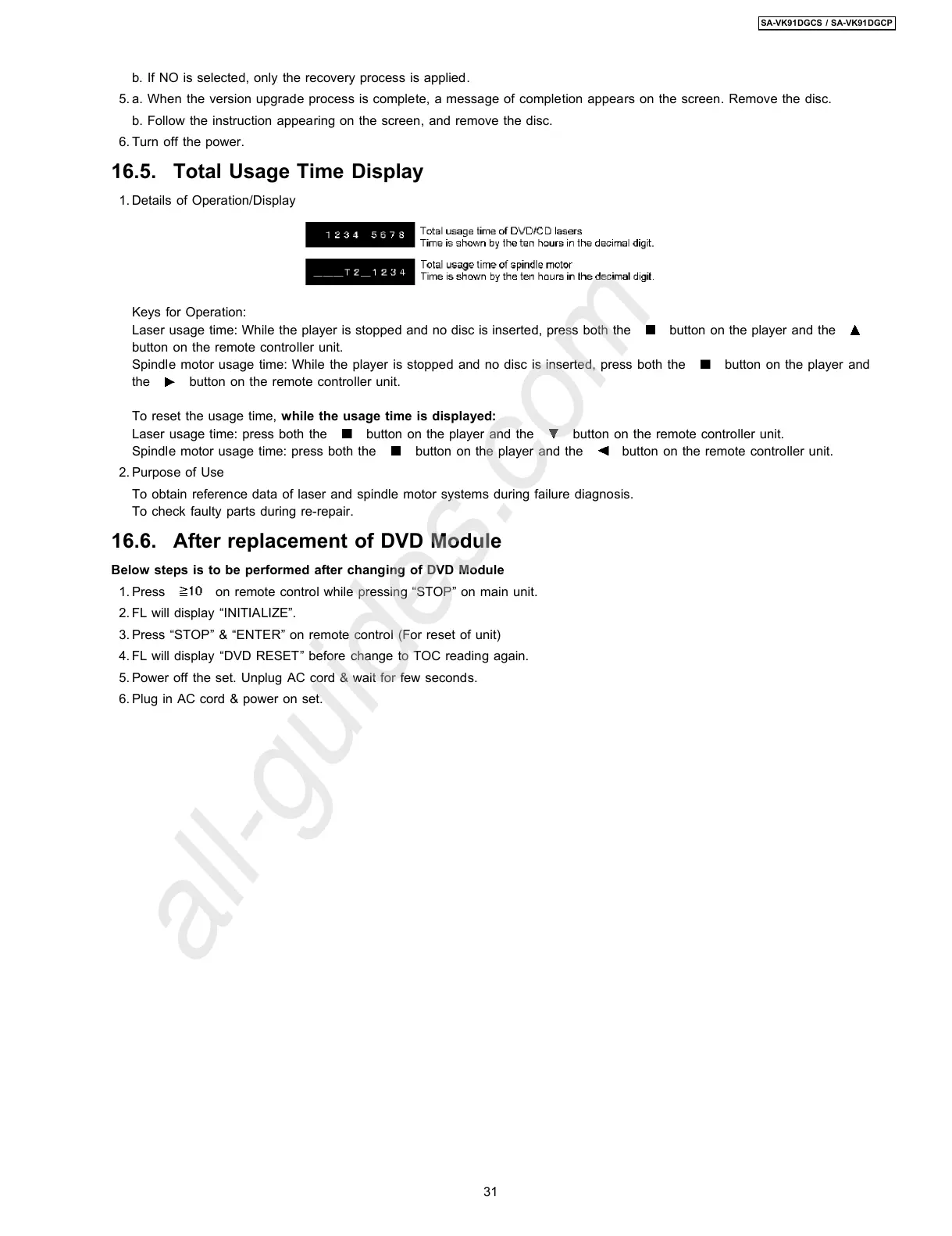 Laser usage time: While the player is stopped and no disc is inserted, press both the
