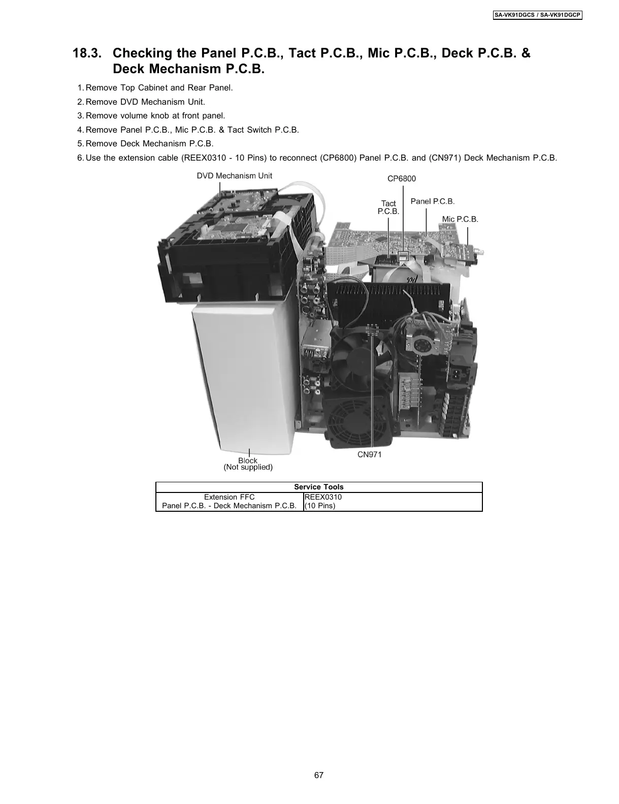 6. Use the extension cable (REEX0310 - 10 Pins) to reconnect (CP6800) Panel P.C.B. and (CN971) Deck Mechanism P.C.B.