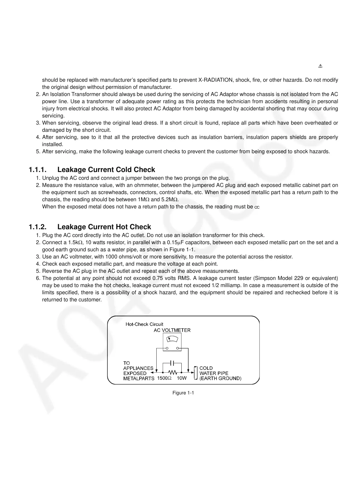 may be used to make the hot checks, leakage current must not exceed 1/2 milliamp. In case a measurement is outside of the
