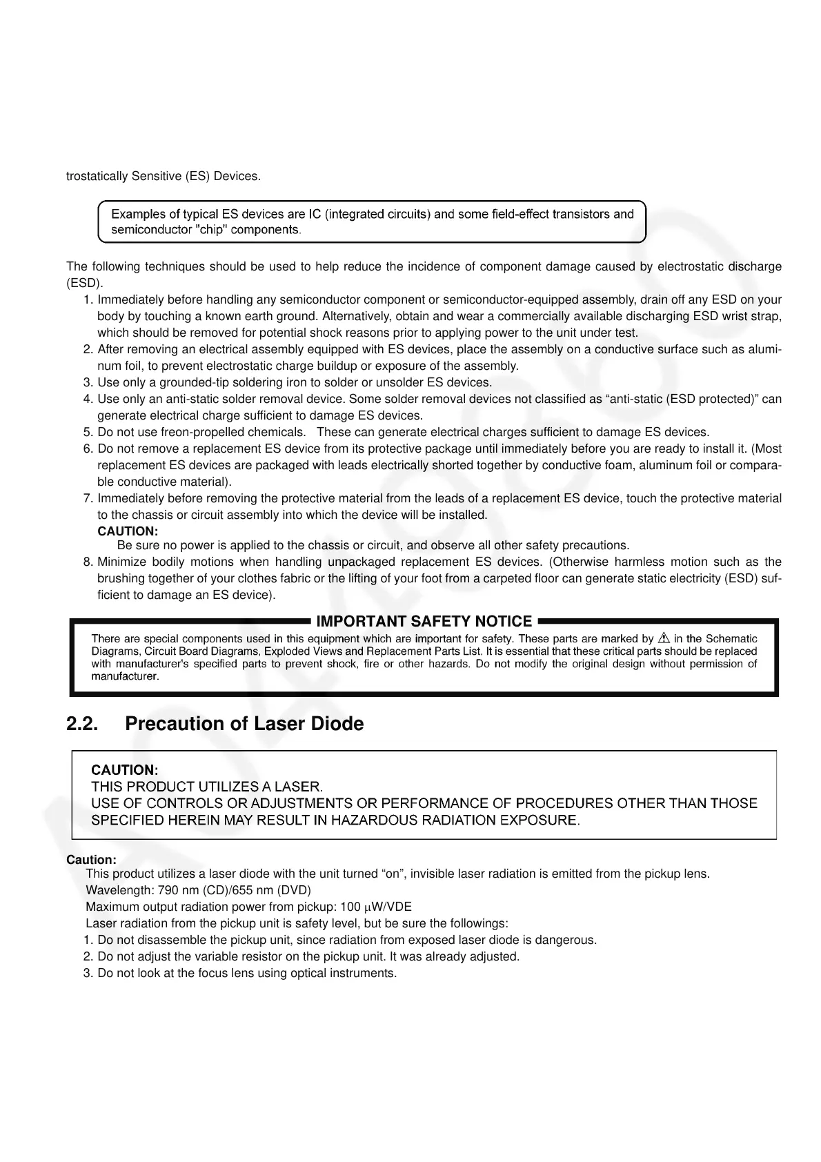 1. Do not disassemble the pickup unit, since radiation from exposed laser diode is dangerous.
