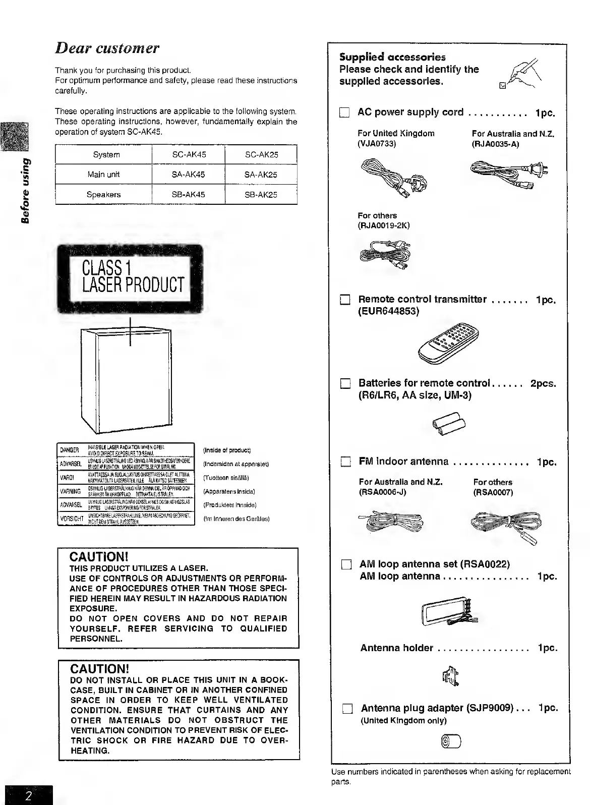 Panasonic SC-AK45 - System Introduction and Accessories; Supplied Accessories Overview; Safety and Handling Precautions; Laser Product and Electrical Safety Warnings