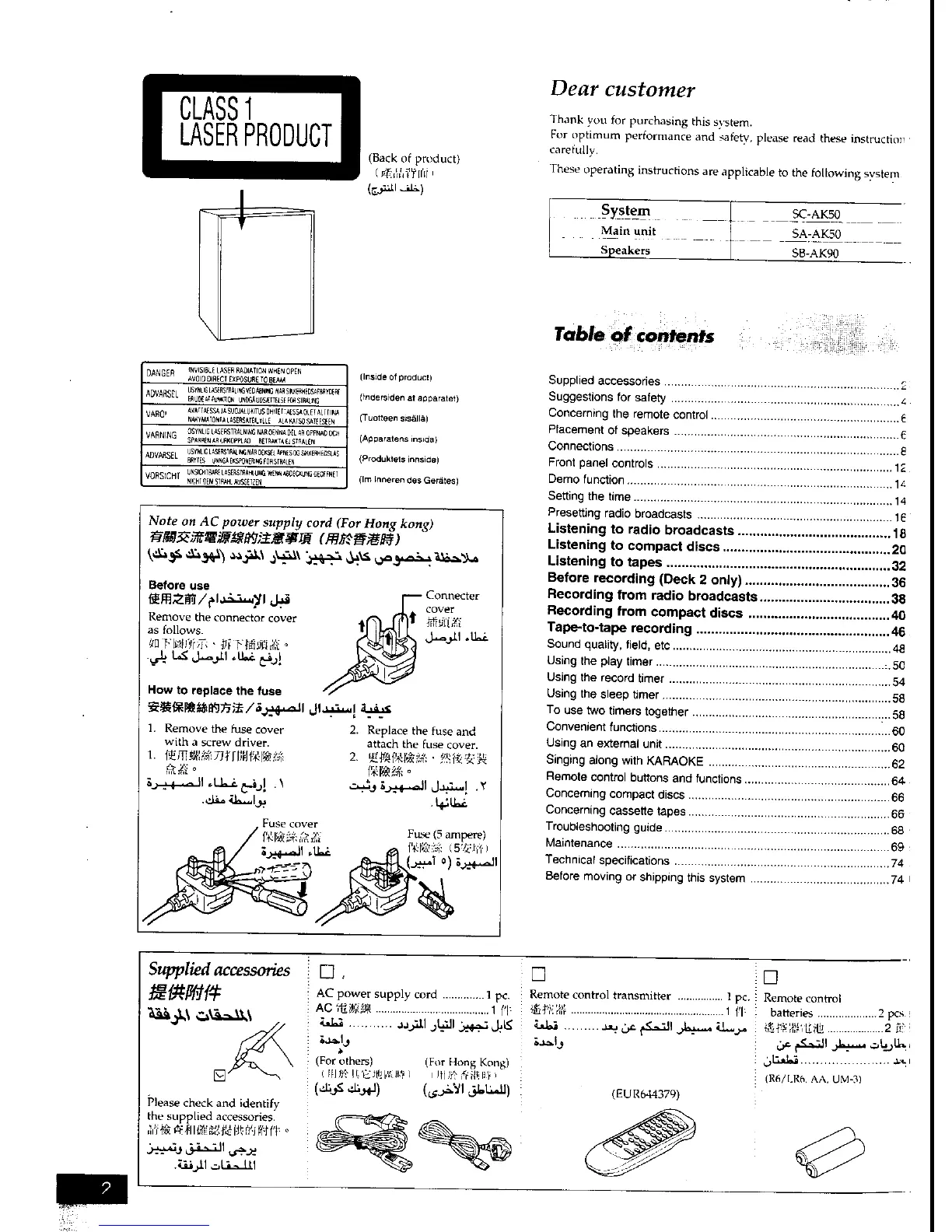 Panasonic SC-AK50 - Table of Contents; Before Use; How to Replace the Fuse; Supplied Accessories