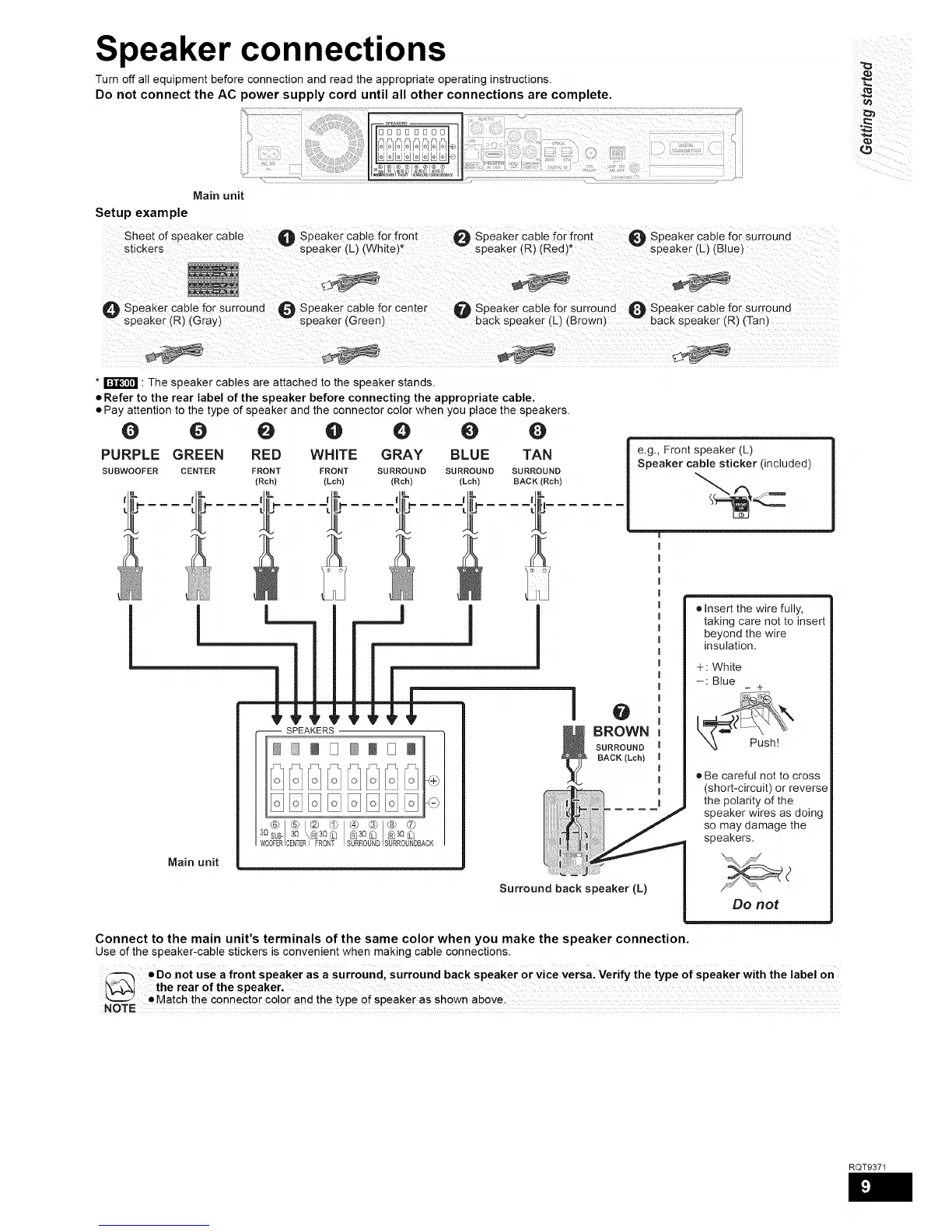 Connect to the main unit's terminals of the same color when you make the speaker connection.