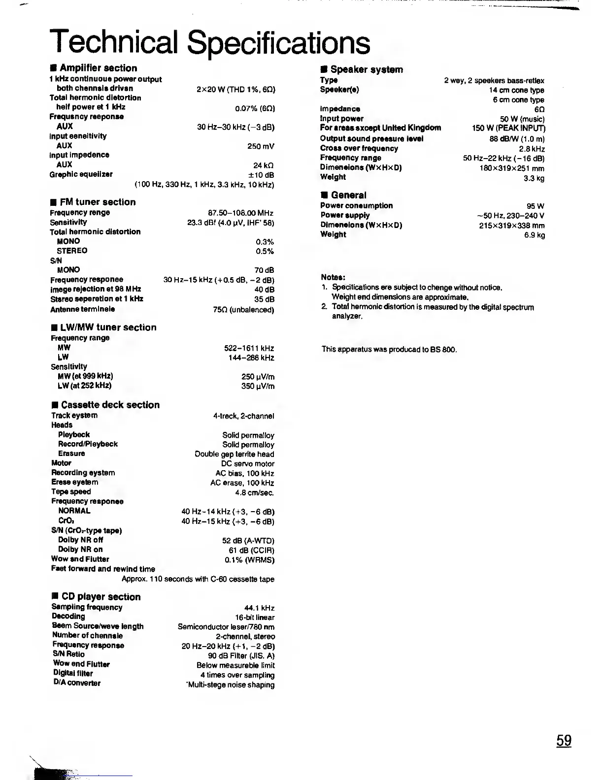 Panasonic SC-CH11 - Technical Specifications; Amplifier Section; Speaker System; General