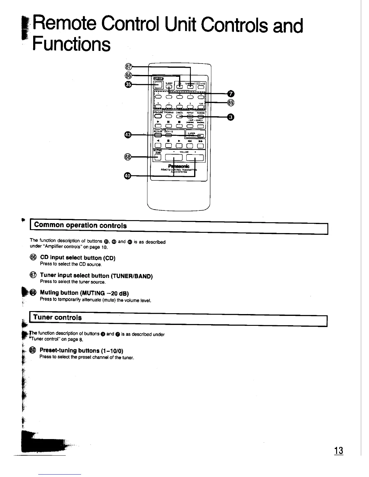 Panasonic SC-CH33 - Remote Control Unit Controls and Functions; Common Operation Controls; Tuner Controls