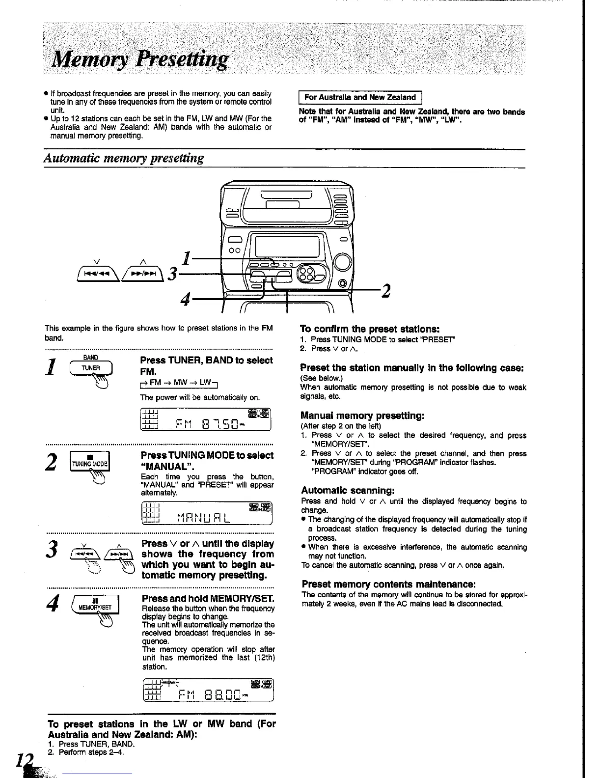 Panasonic SC-CH34 - Memory Presetting; Automatic Memory Presetting; Manual Memory Presetting; Automatic Scanning