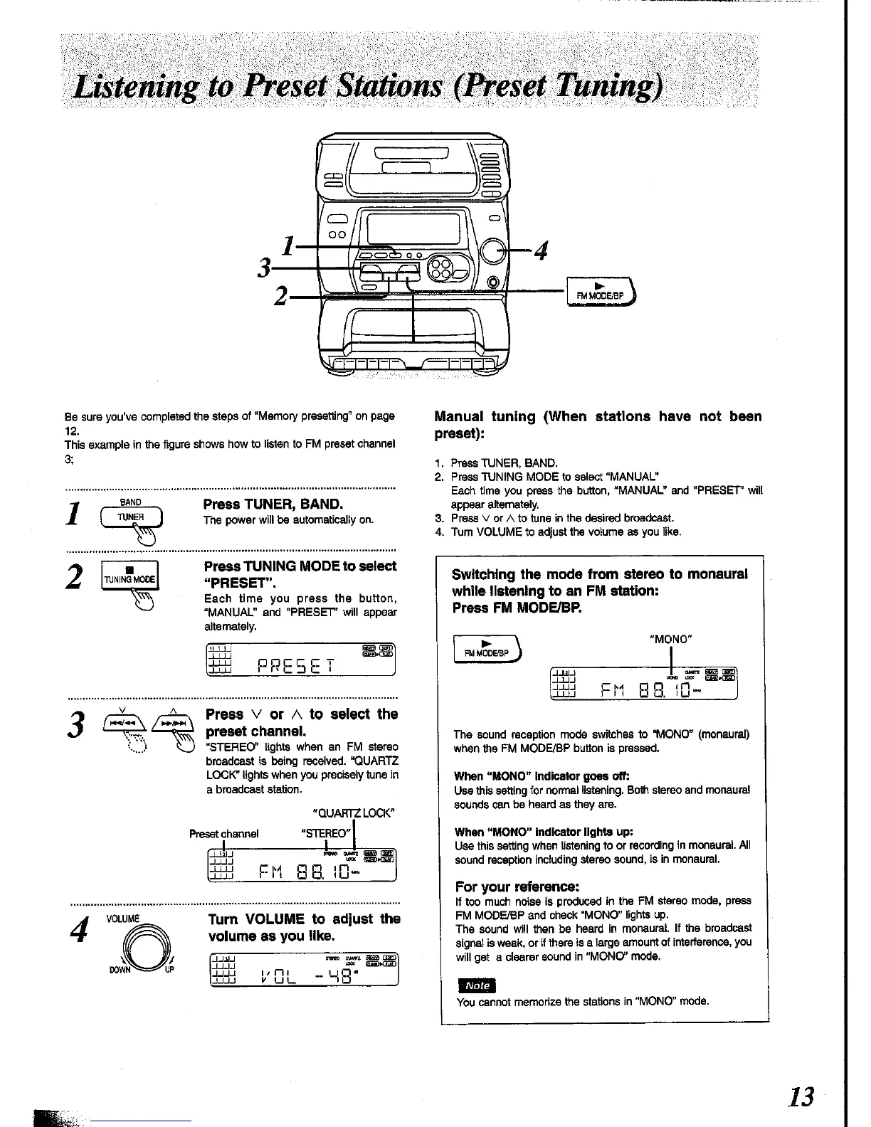Panasonic SC-CH34 - Listening to Preset Stations (Preset Tuning); Manual Tuning; FM Stereo to Monaural Switching