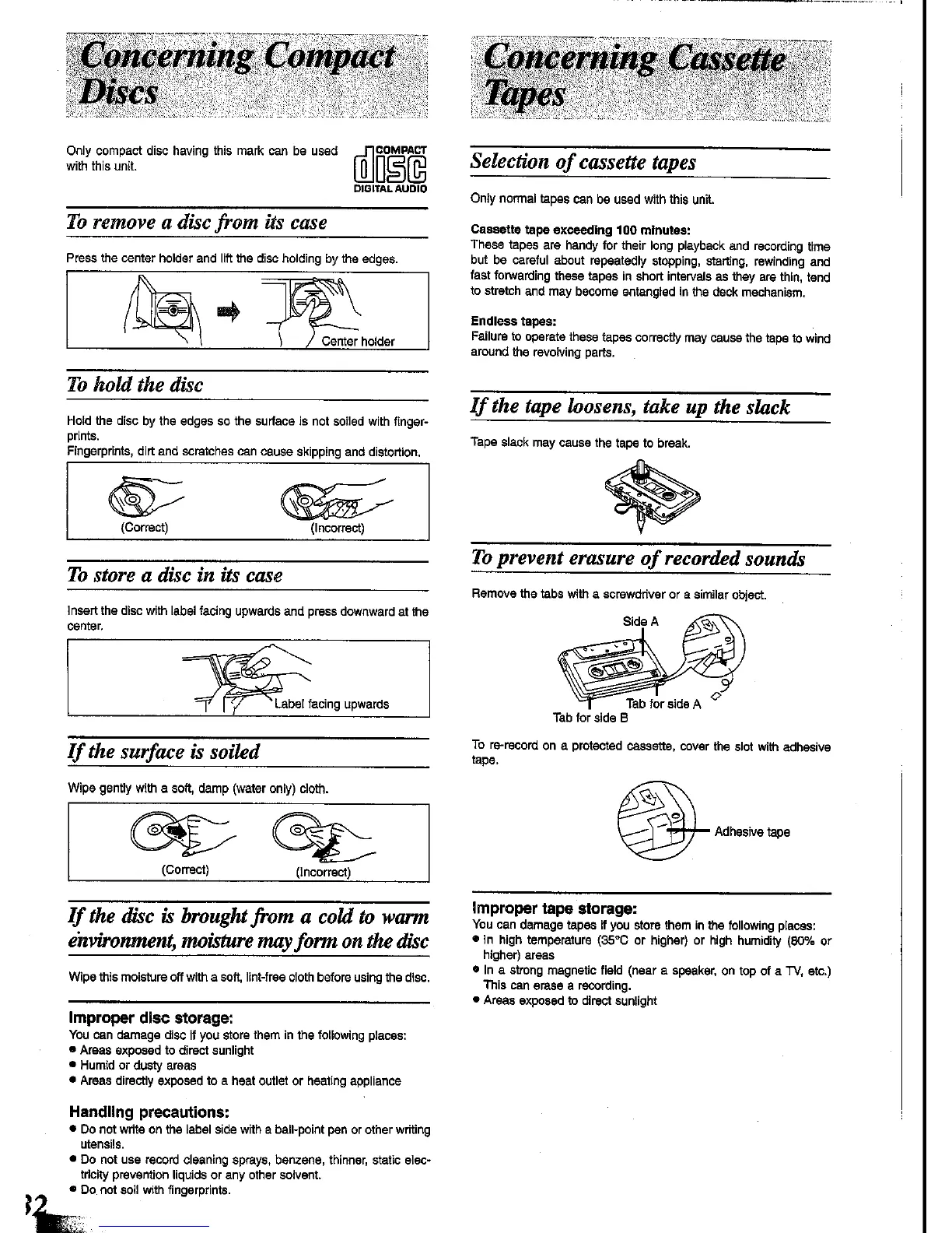 Panasonic SC-CH34 - Concerning Compact Discs; Disc Handling and Storage; Disc Care and Precautions; Concerning Cassette Tapes