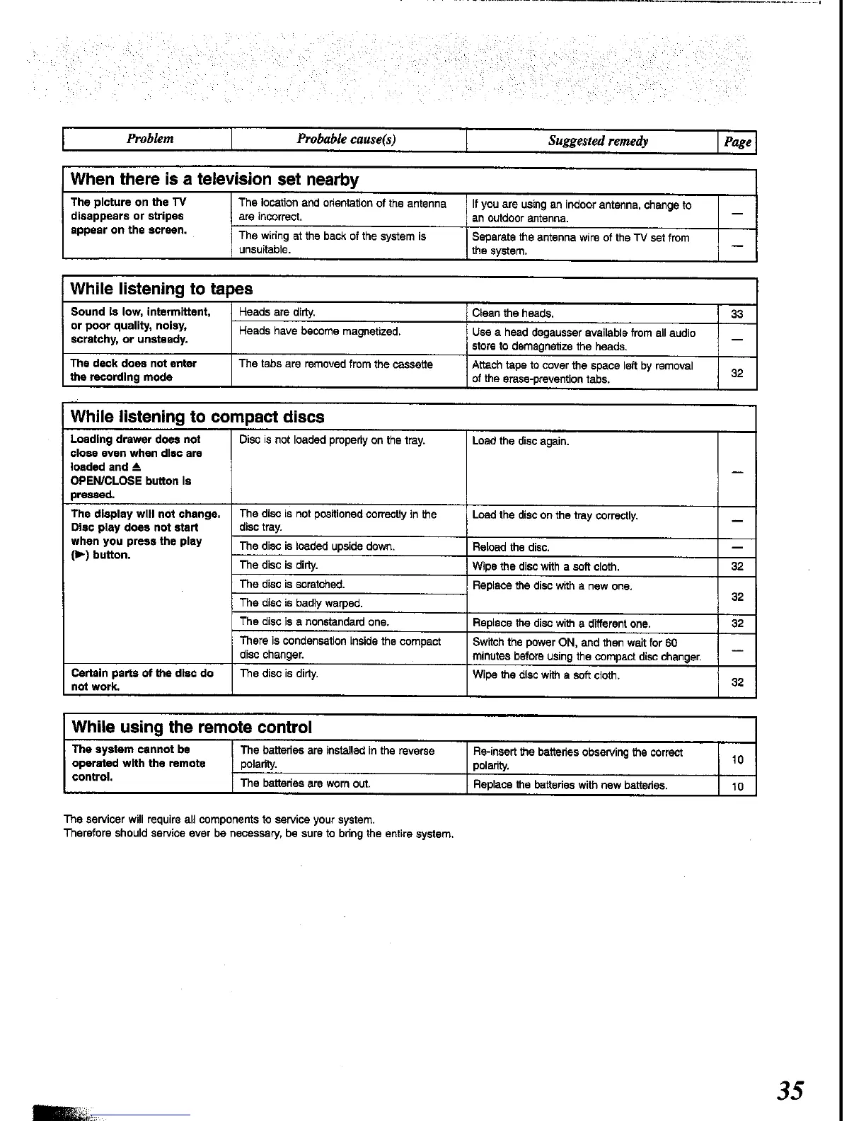 Panasonic SC-CH34 - Television Interference Troubleshooting; Tape Playback Troubleshooting; Compact Disc Troubleshooting; Remote Control Troubleshooting