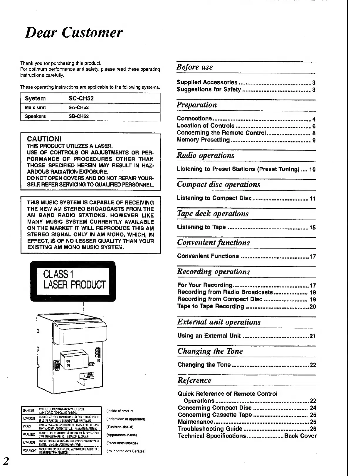 Panasonic SC-CH52 - Dear Customer; Class 1 Laser Product