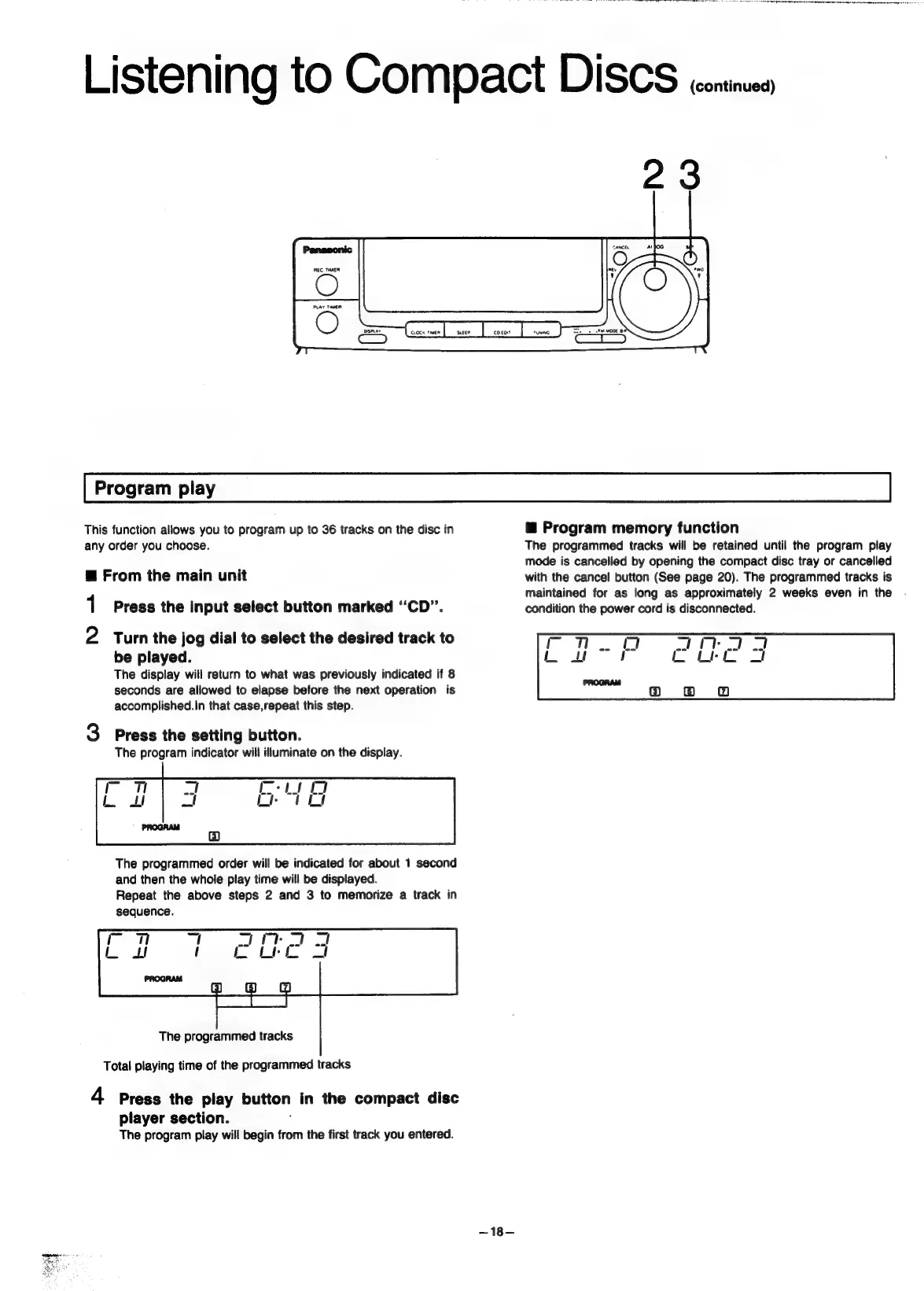 Panasonic SC-CH55 - Listening to Compact Discs (continued); Program play; Program memory function