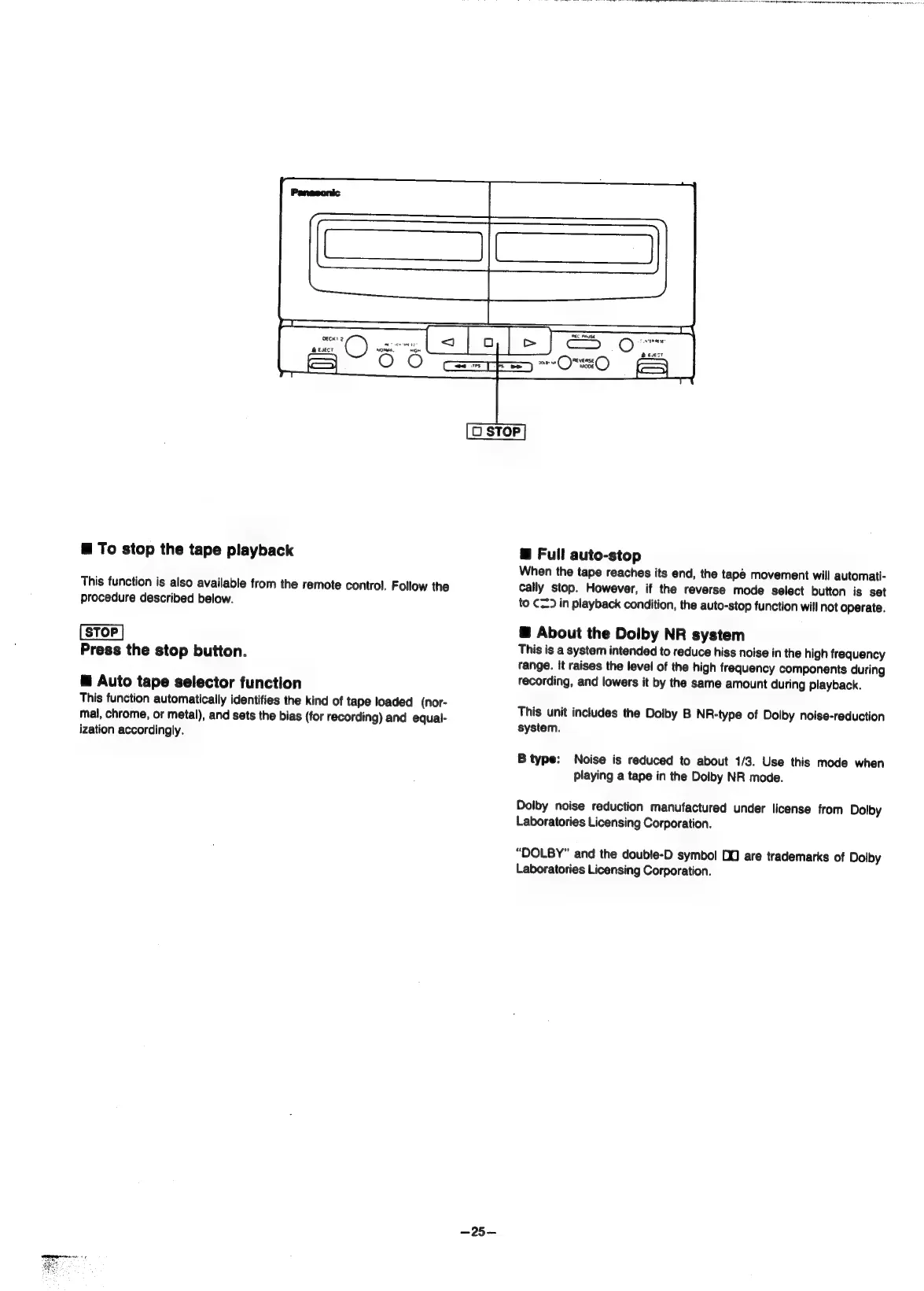 Panasonic SC-CH55 - To stop the tape playback; Full auto-stop; About the Dolby NR system
