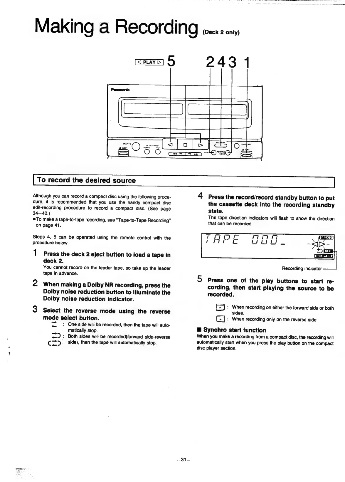 Panasonic SC-CH55 - Making a Recording (Deck 2 only); To record the desired source; Synchro start function