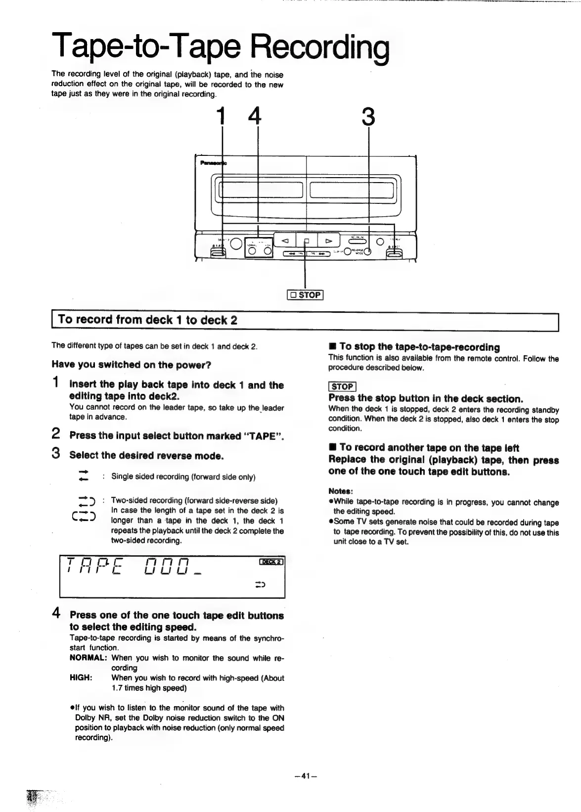 Panasonic SC-CH55 - Tape-to-Tape Recording; To record from deck 1 to deck 2; To stop the tape-to-tape-recording; To record another tape on the tape left