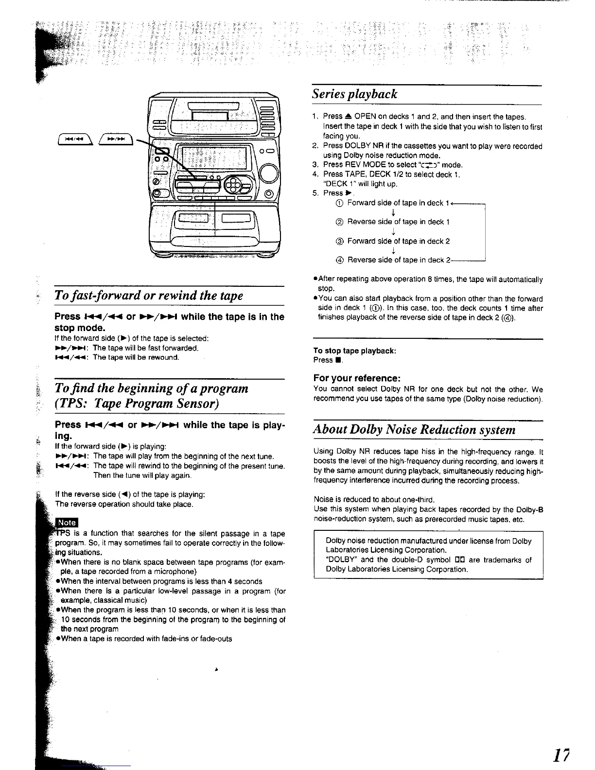 Panasonic SC-CH74 - Series Playback; To Fast-Forward or Rewind the Tape; About Dolby Noise Reduction System; To Find the Beginning of a Program