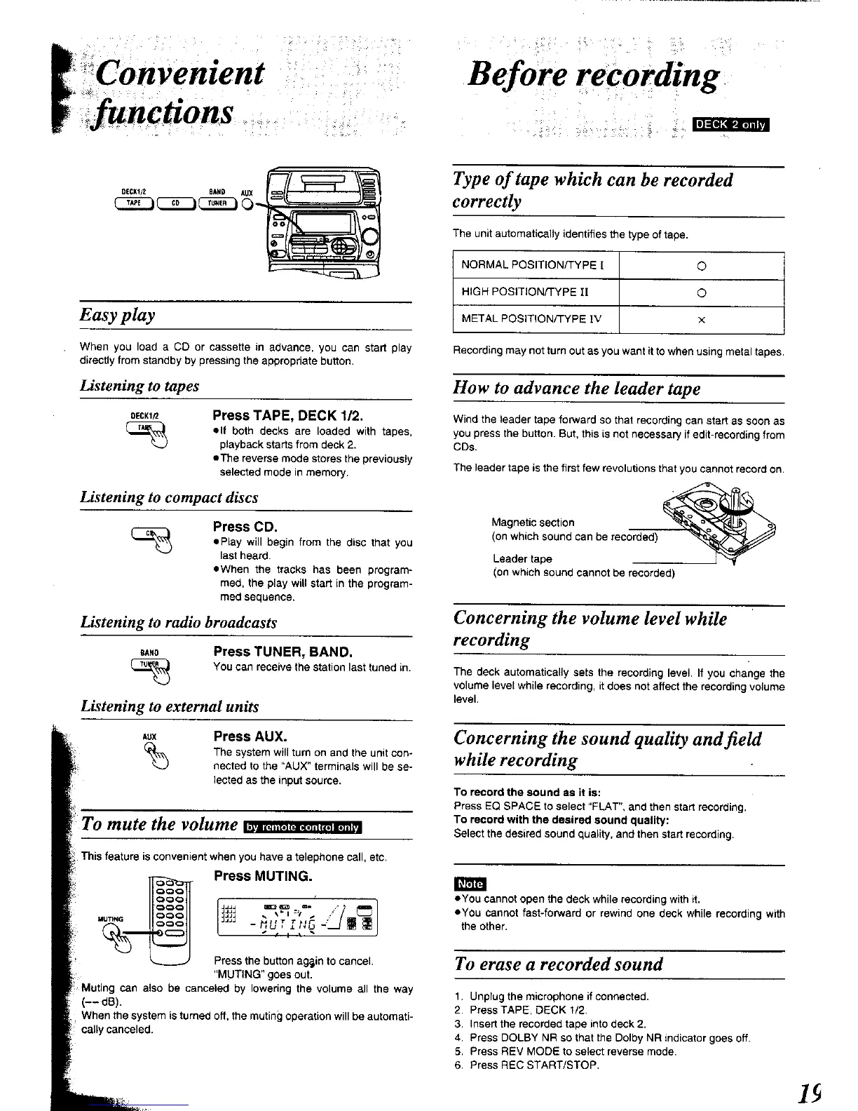 Panasonic SC-CH74 - Convenient Functions; Before Recording; Easy Play; How to Advance the Leader Tape