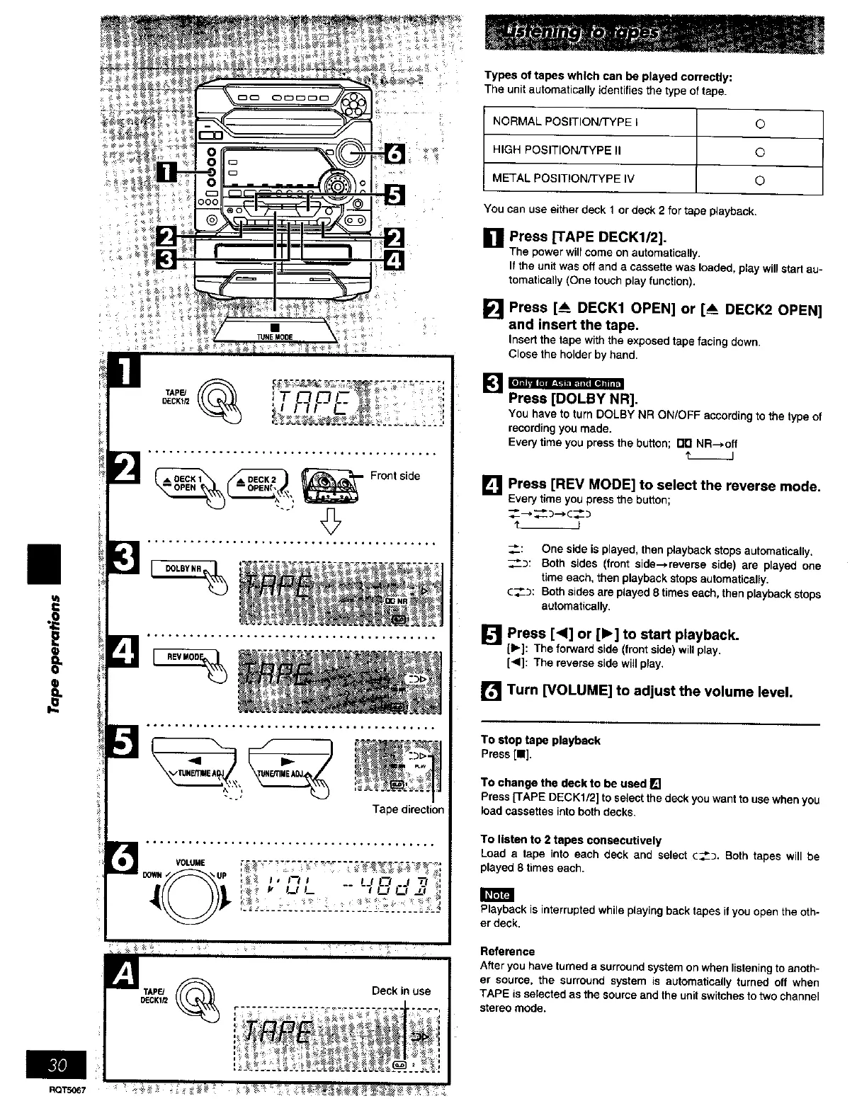 You can use either deck 1 or deck 2 for tape playback.