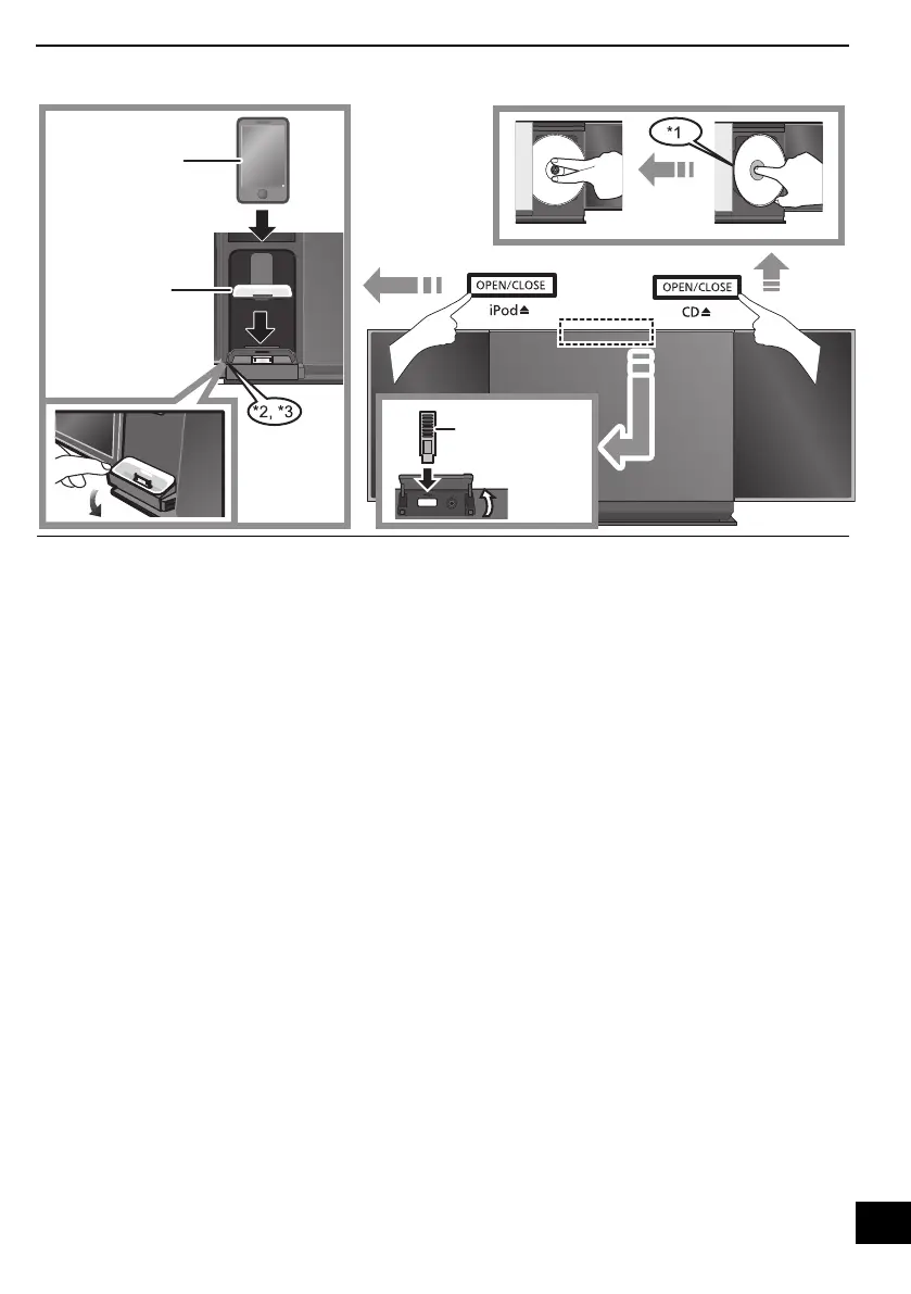 *3: When inserting or removing the iPod/iPhone, tilt the dock slightly by holding the corner of the dock.