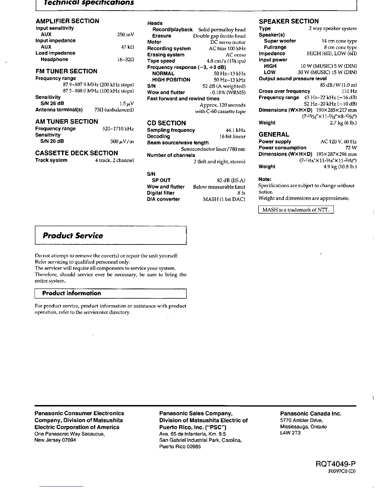 Panasonic SC-PM15 - Technical Specifications; Amplifier Section Specifications; FM Tuner Section Specifications; AM Tuner Section Specifications