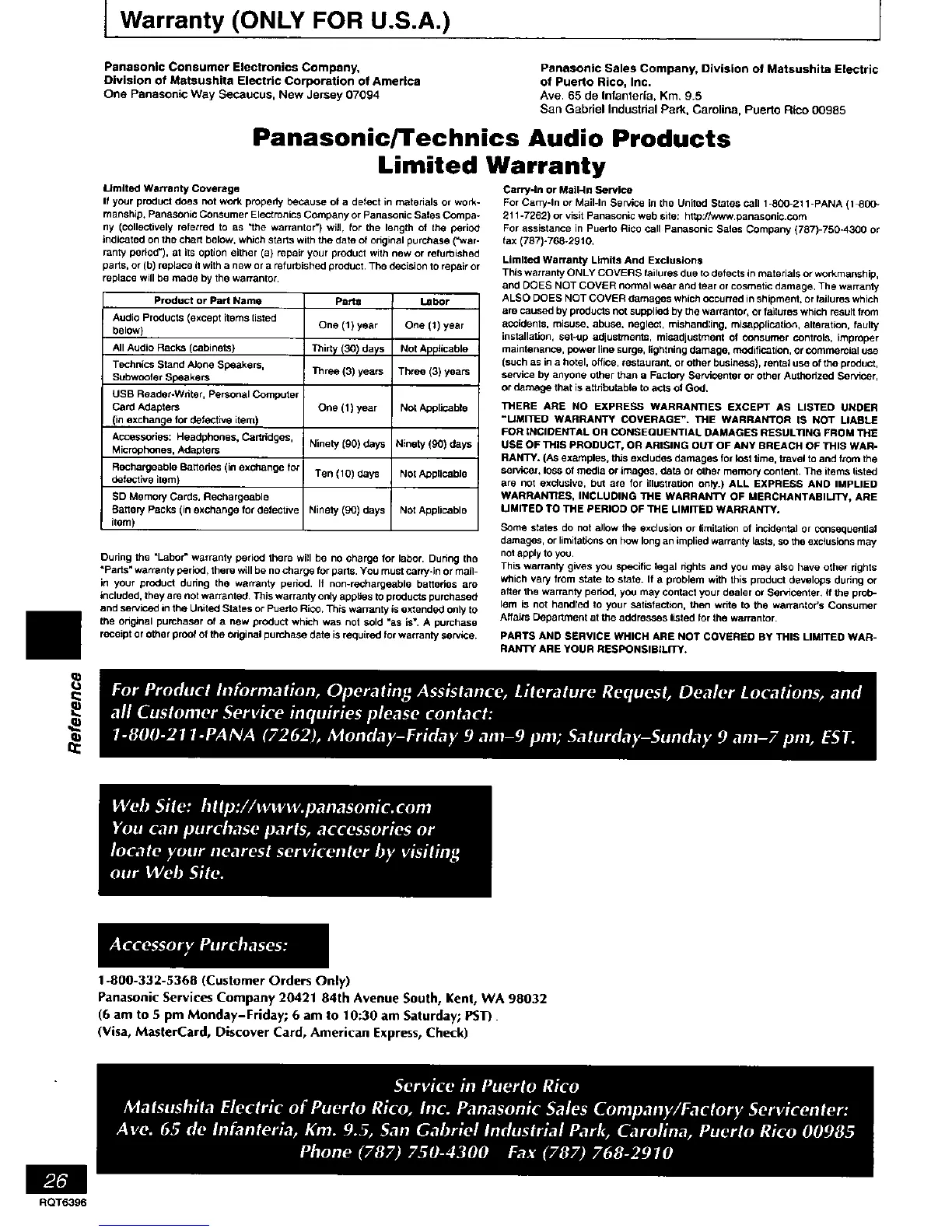 Panasonic SC-PM17 - Warranty Information