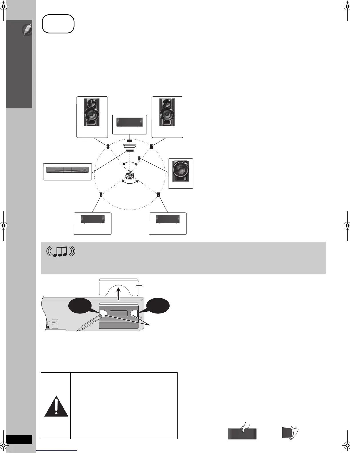 Place the front, center, and surround speakers at approximately the same distance from the seating position. The angles in the diagram are