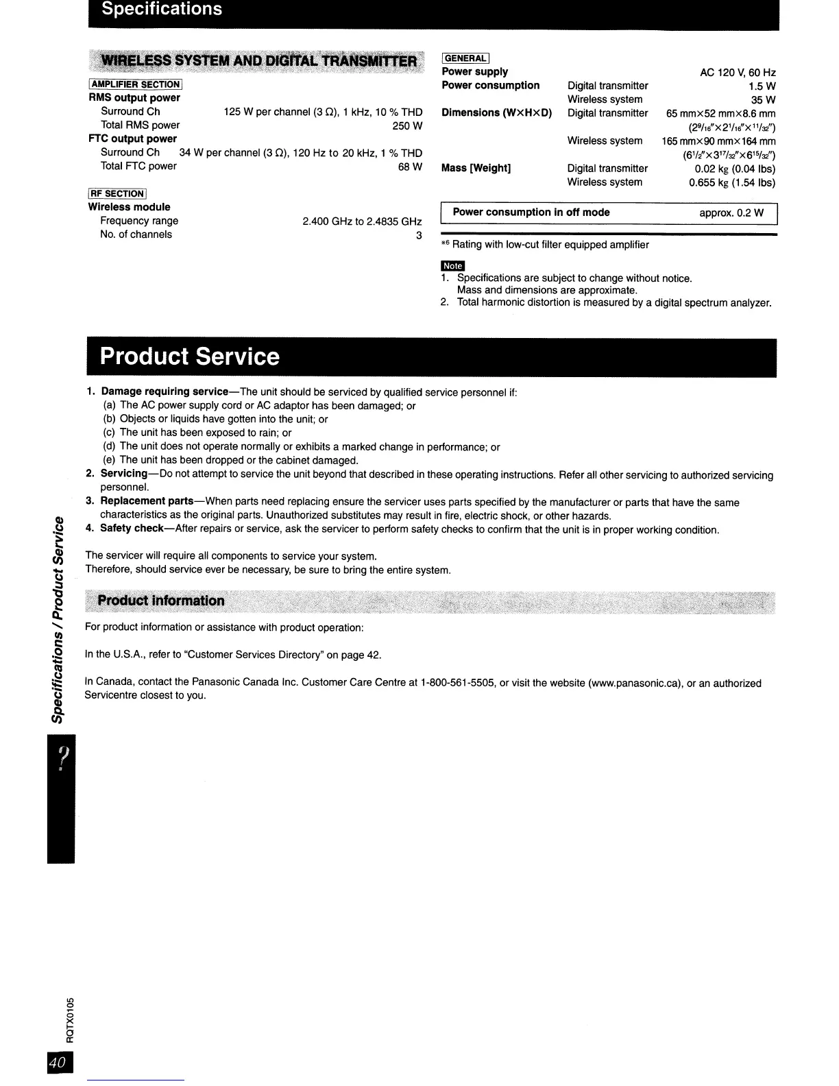 Canada, contact the Panasonic Canada inc. Customer Care Centre at 1-800-561-5505, or visit the website (www.panasonic.ca). or