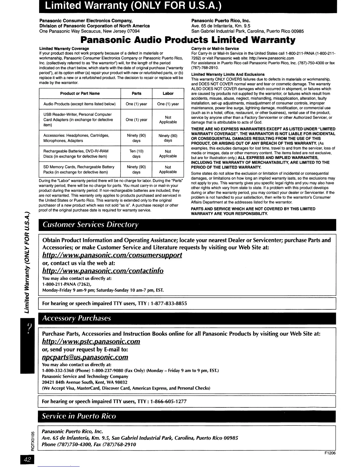 workmanship, Panasonic Consumer Electronics Company or Panasonic Puerto Rico.