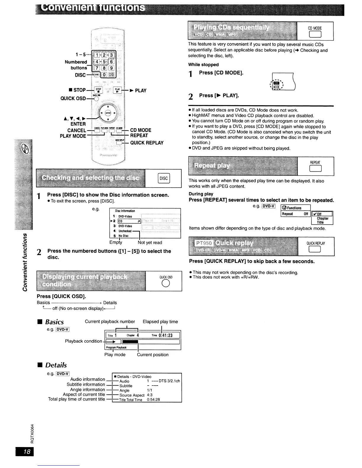 Panasonic SC-PT950 - Convenient Functions; Playing Cds Sequentially;Repeat Play;Quick Replay; Checking and Selecting the Disc; Displaying Current Playback Condition