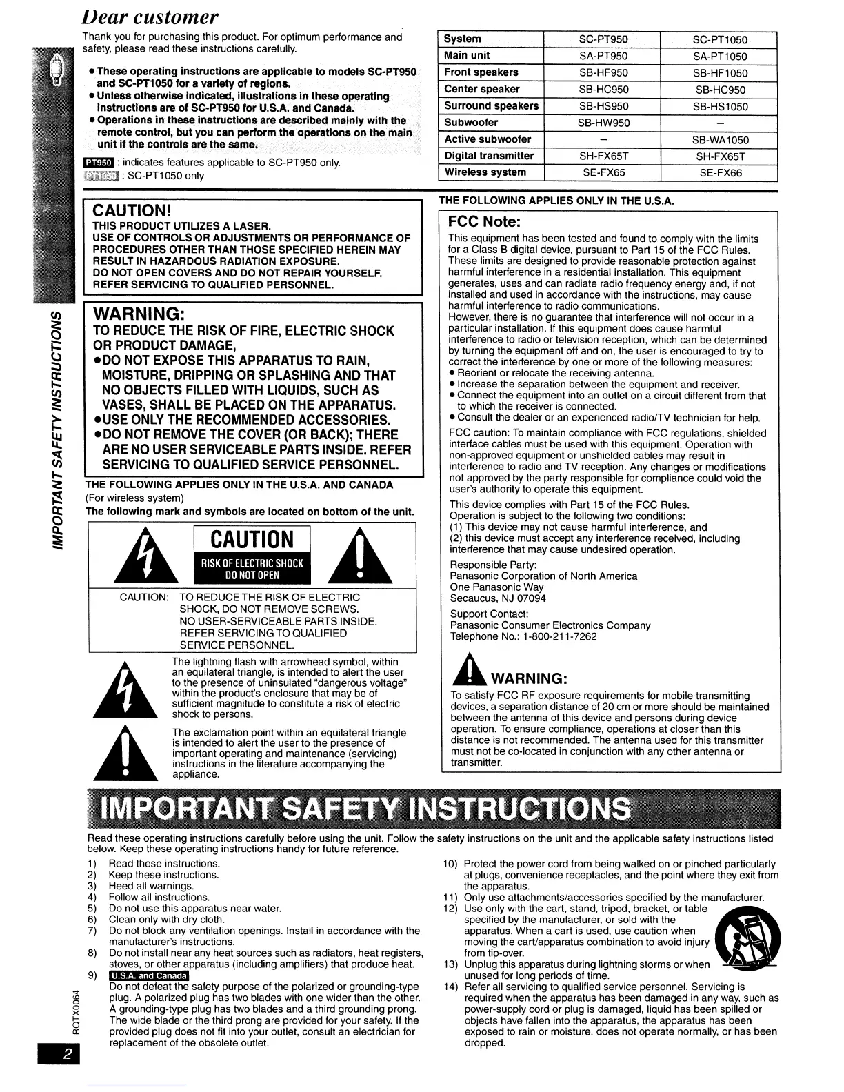 Panasonic SC-PT950 - Important Safety Instructions; FCC Compliance Note