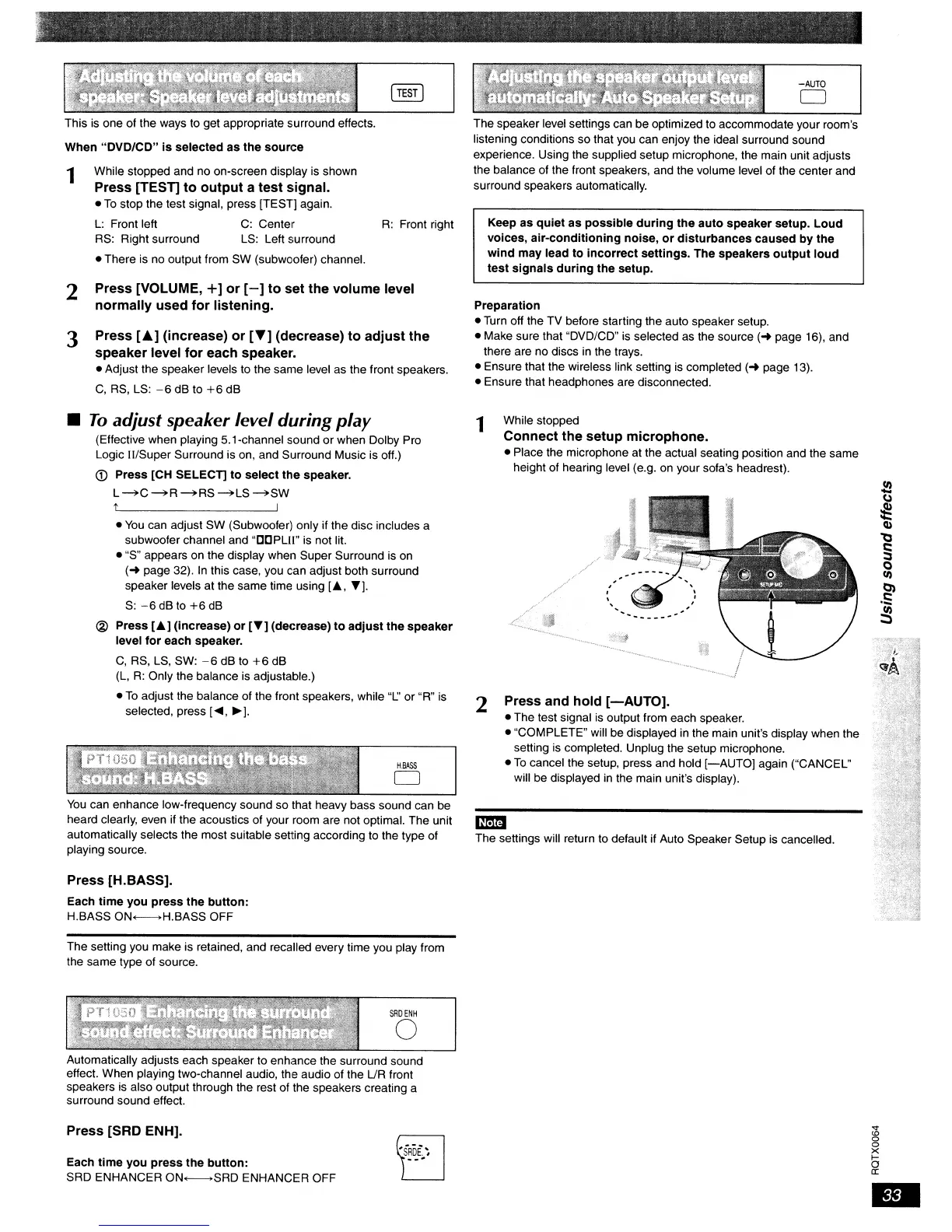 Panasonic SC-PT950 - Adjusting the Volume of each Speaker: Speaker Level Adjustments; Adjusting the Speaker Output Level Automatically: Auto Speaker Setup; Enhancing the Bass Sound: H.bass; Enhancing the Surround Sound Effect: Surround Enhancer