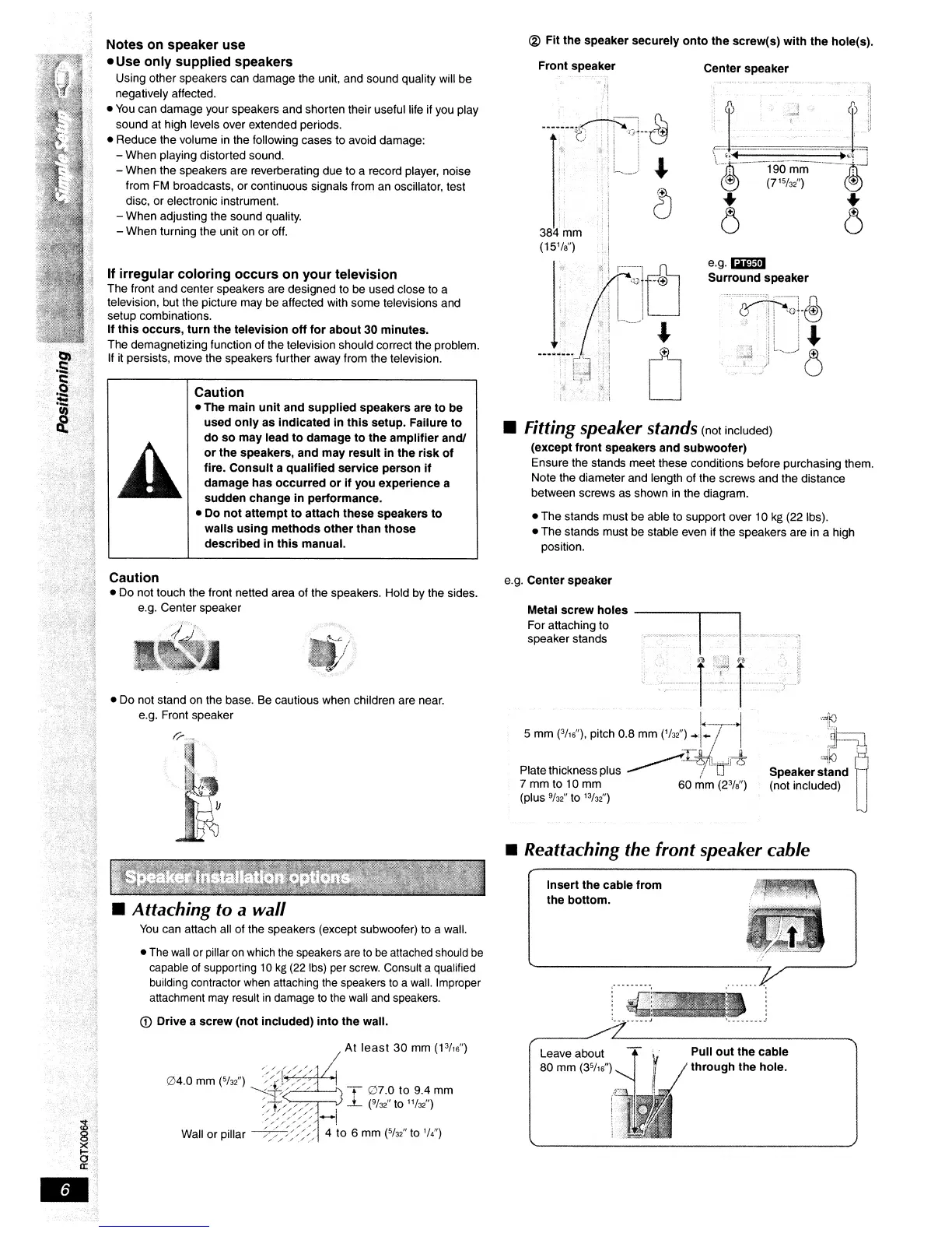Panasonic SC-PT950 - Speaker Installation Options; Attaching to a Wall; Reattaching the Front Speaker Cable;Fitting Speaker Stands; If Irregular Coloring Occurs on Your Television