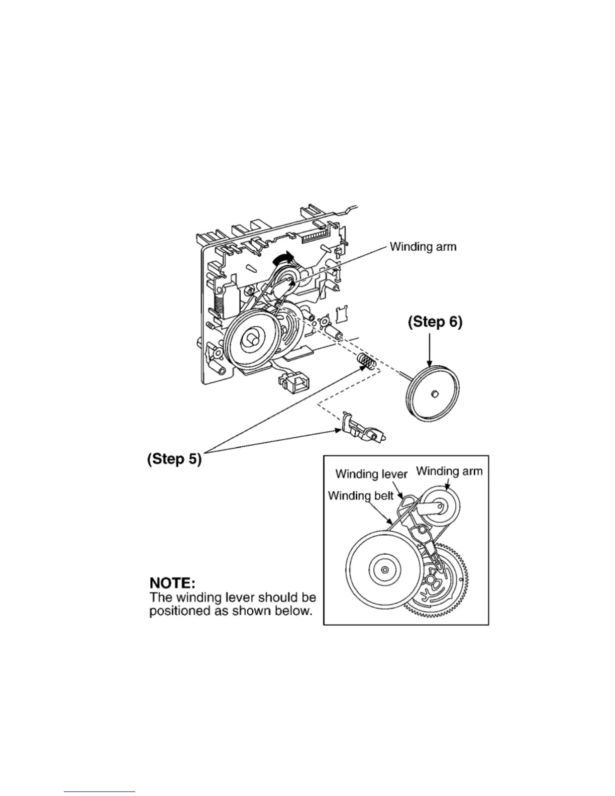 Step 5 Install the winding lever and spring while pressing the winding arm in the direction of arrow.