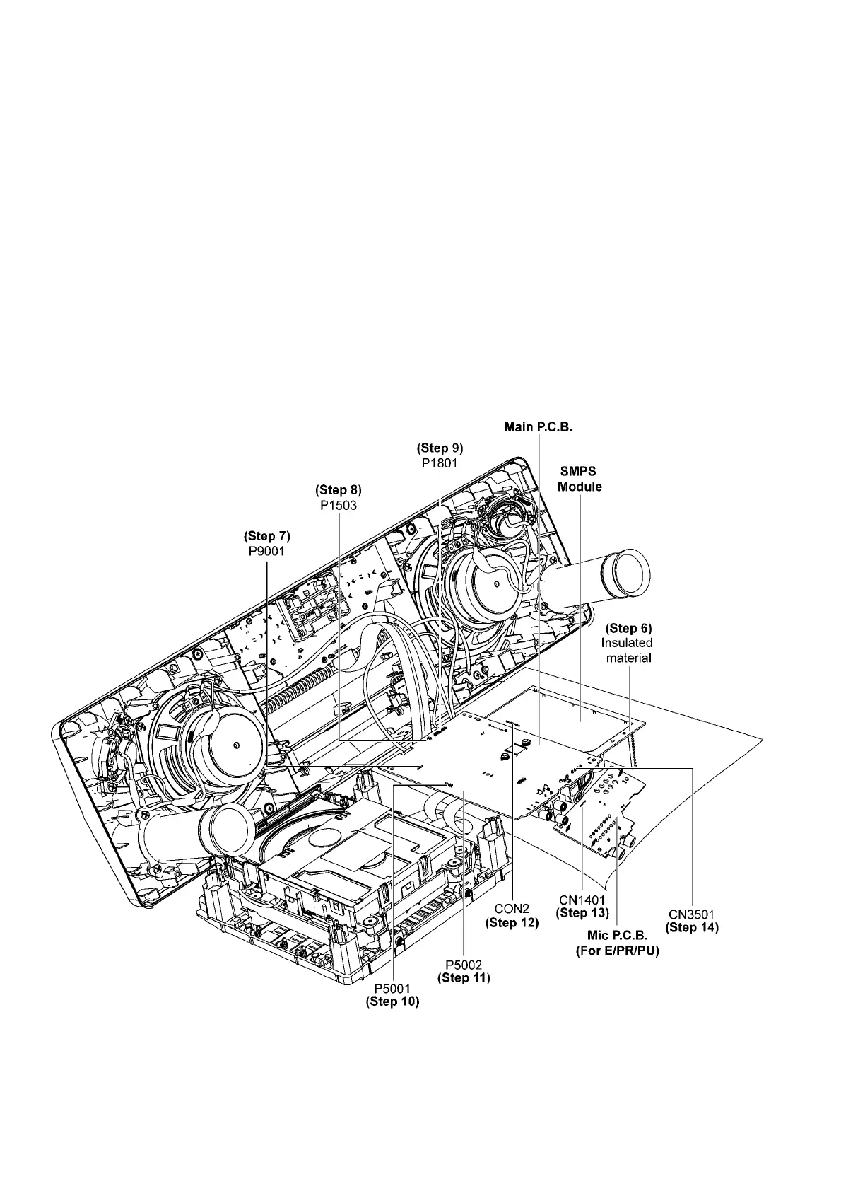 Step 6 Place Main P.C.B. and SMPS Module on the insulated material as shown.