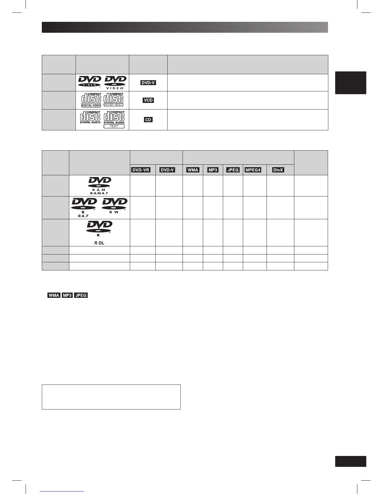 • It may not be possible to play all the above-mentioned discs in some cases due to the type of disc, the condition of the