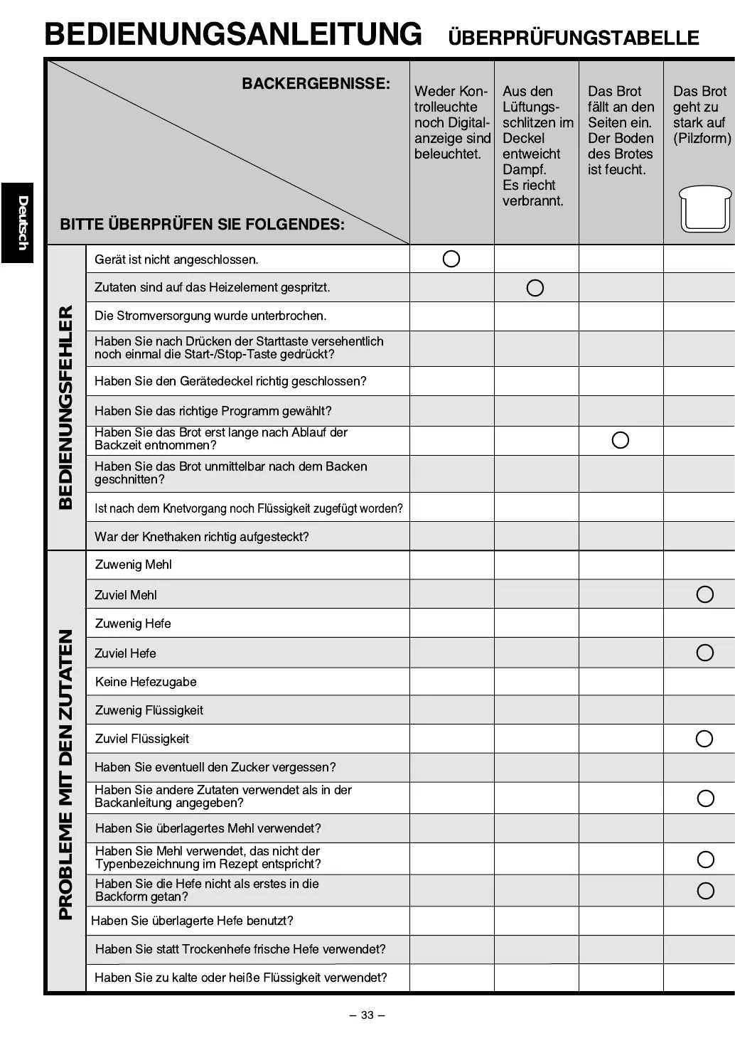 Panasonic SD-206 - Überprüfungstabelle