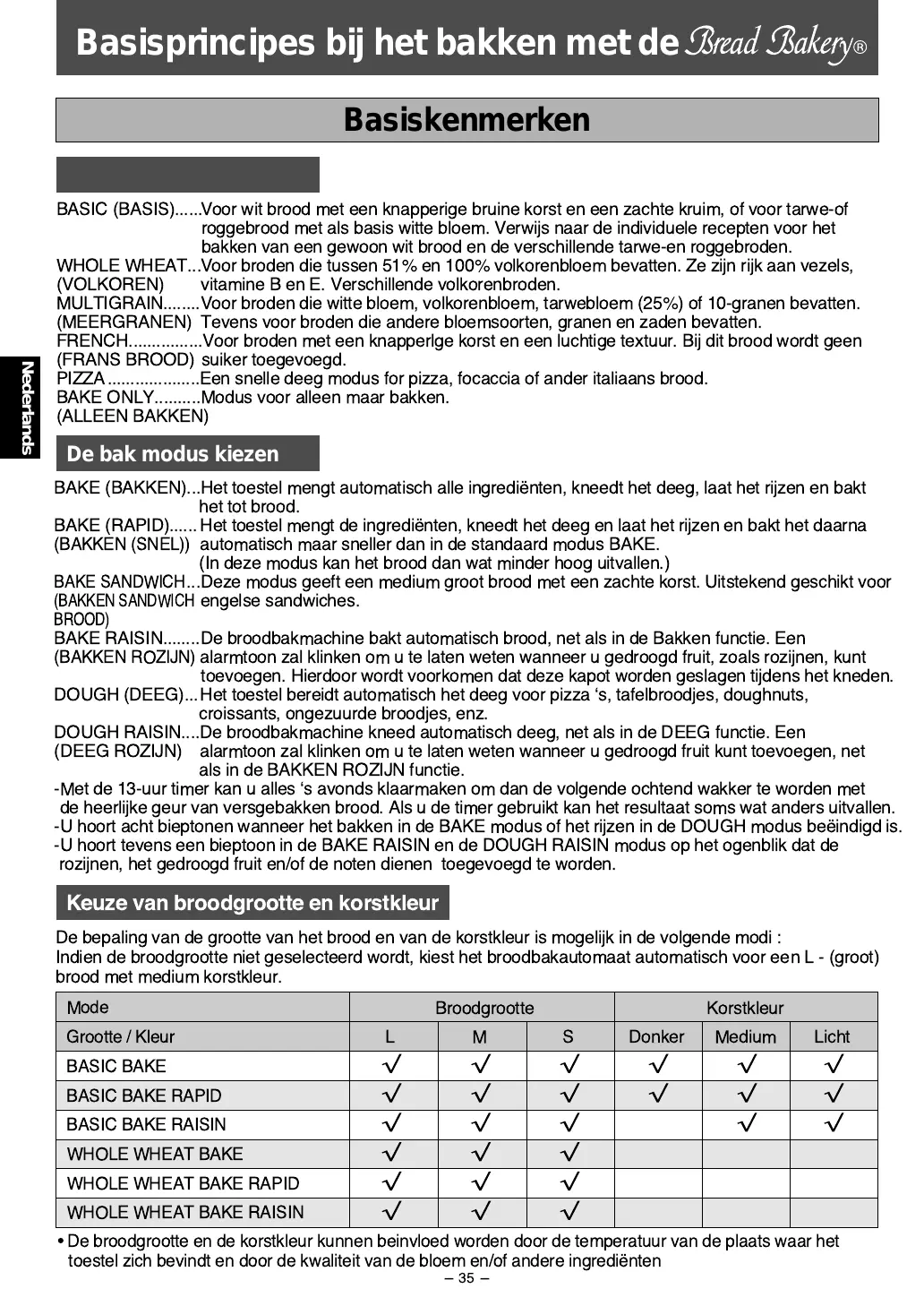 De bepaling van de grootte van het brood en van de korstkleur is mogelijk in de volgende modi :