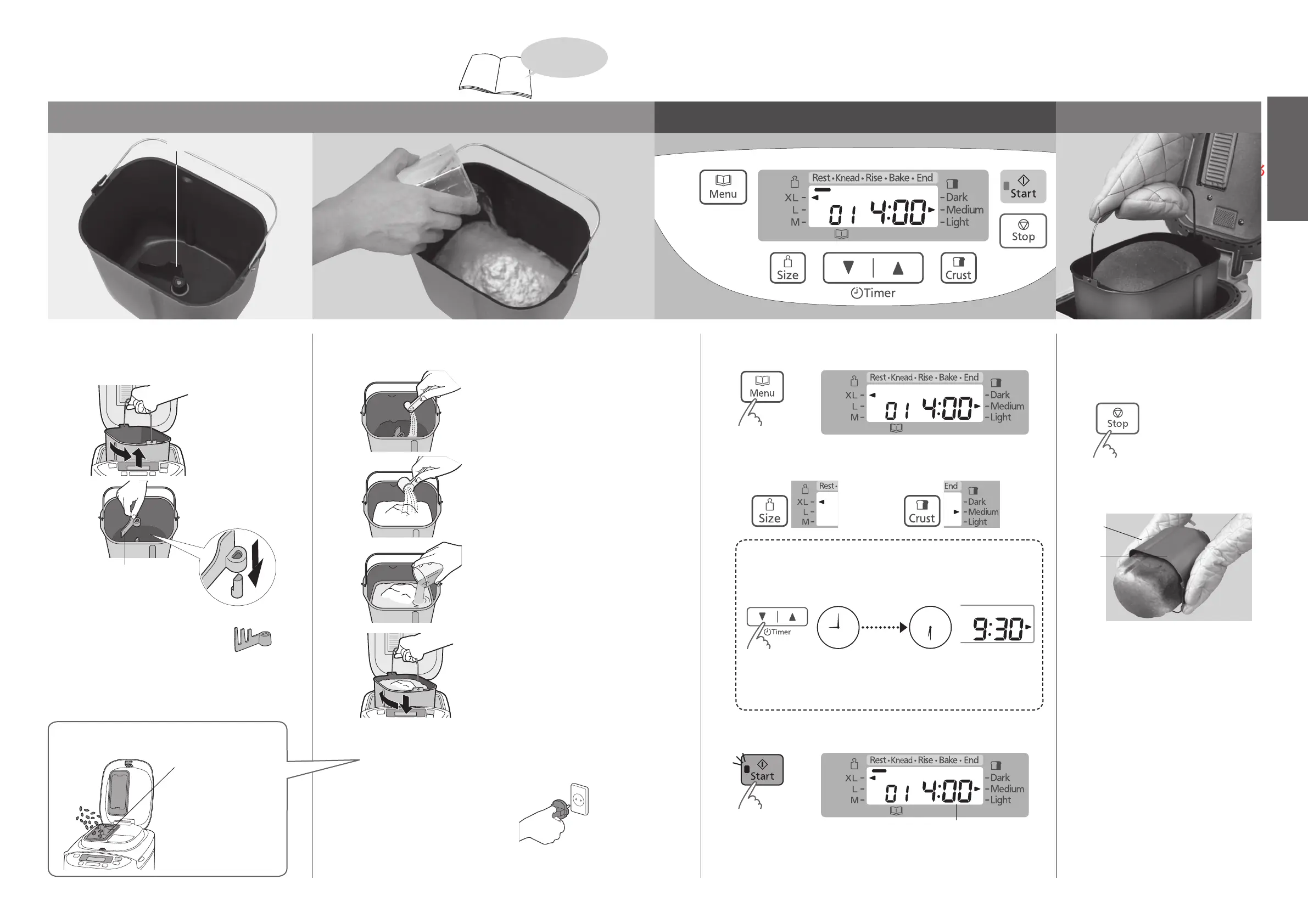Place the ingredients in the bread pan Set the program and start Remove the bread