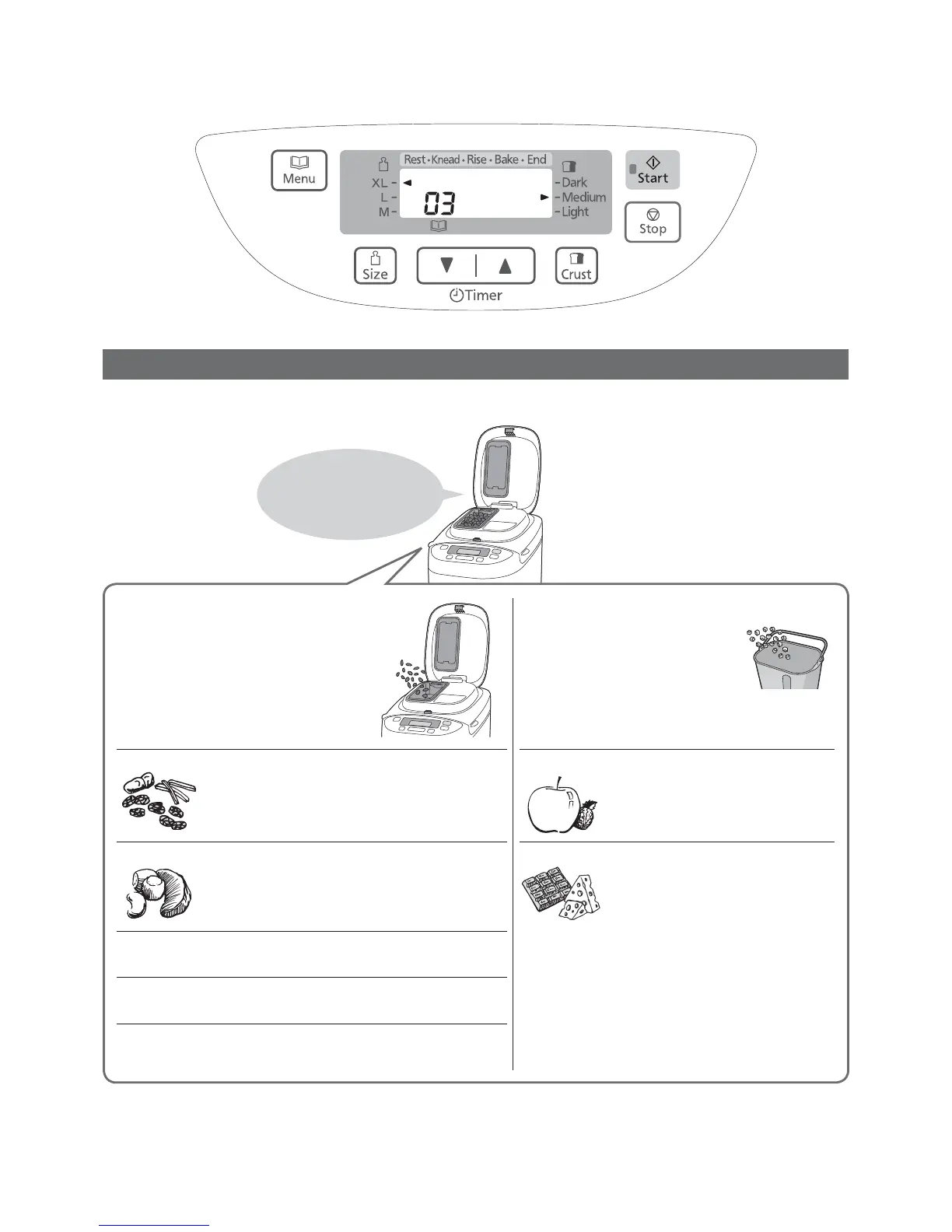 By selecting a menu with raisin (03, 06, 14, 17, 19 or 25), you can mix your favourite ingredients into the dough to make all kinds of flavoured