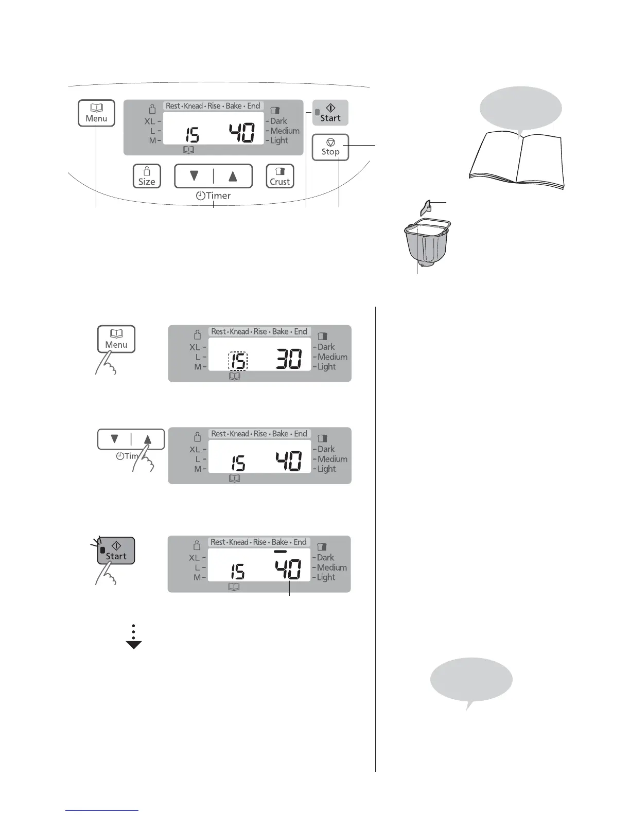 Set the bread pan into the main unit, and plug the machine into the socket. (Make sure the start light is off.)