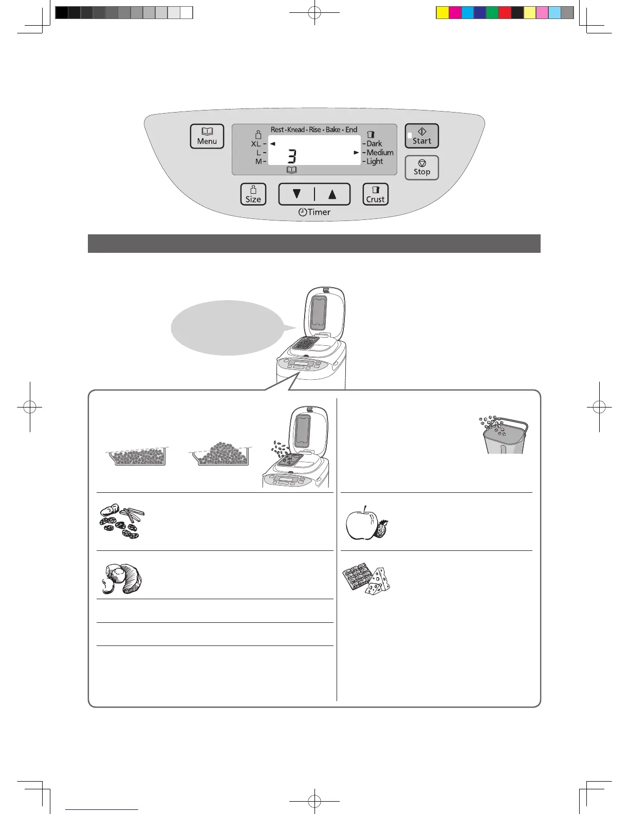 By selecting a menu with Raisin (3, 4, 7, 16, 20, 21, 23 or 31), you can mix your favourite ingredients into the dough to make all kinds of