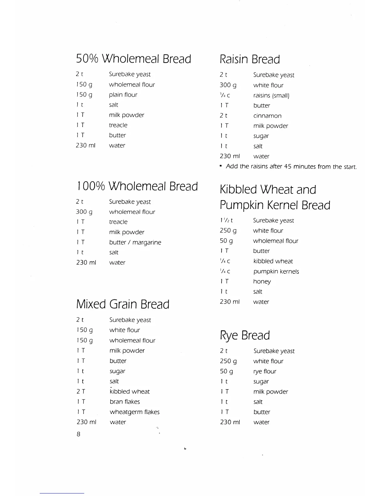 Panasonic SD-BT2P - 50;100 Percent Wholemeal Bread; Raisin Bread; Kibbled Wheat and Pumpkin Bread; Mixed Grain Bread;Rye Bread