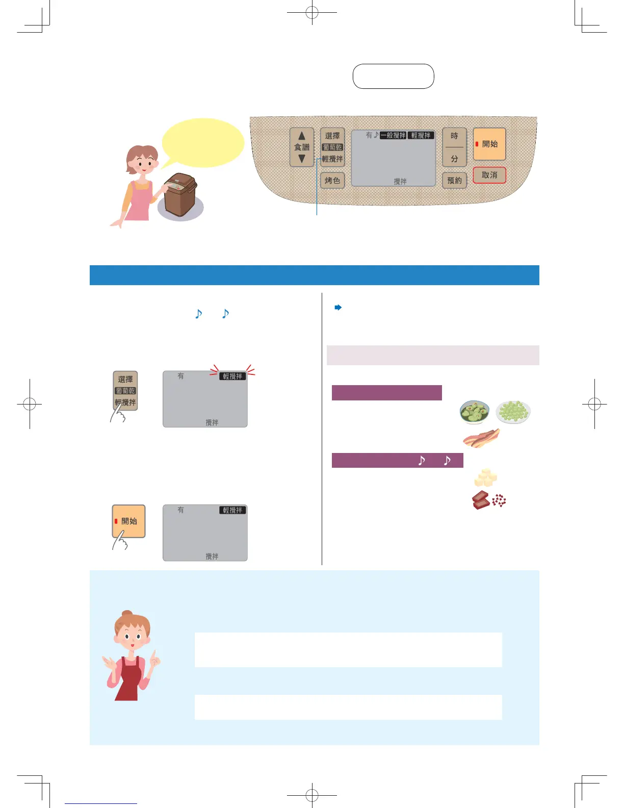 Ӫ Addition of hard ingredients may damage the fluorine coatings inside the bread pan.