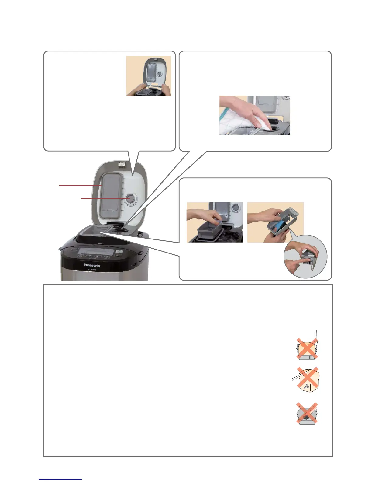 • No utilice utensilios duros como un cuchillo o un tenedor cuando extraiga el pan del recipiente del pan.