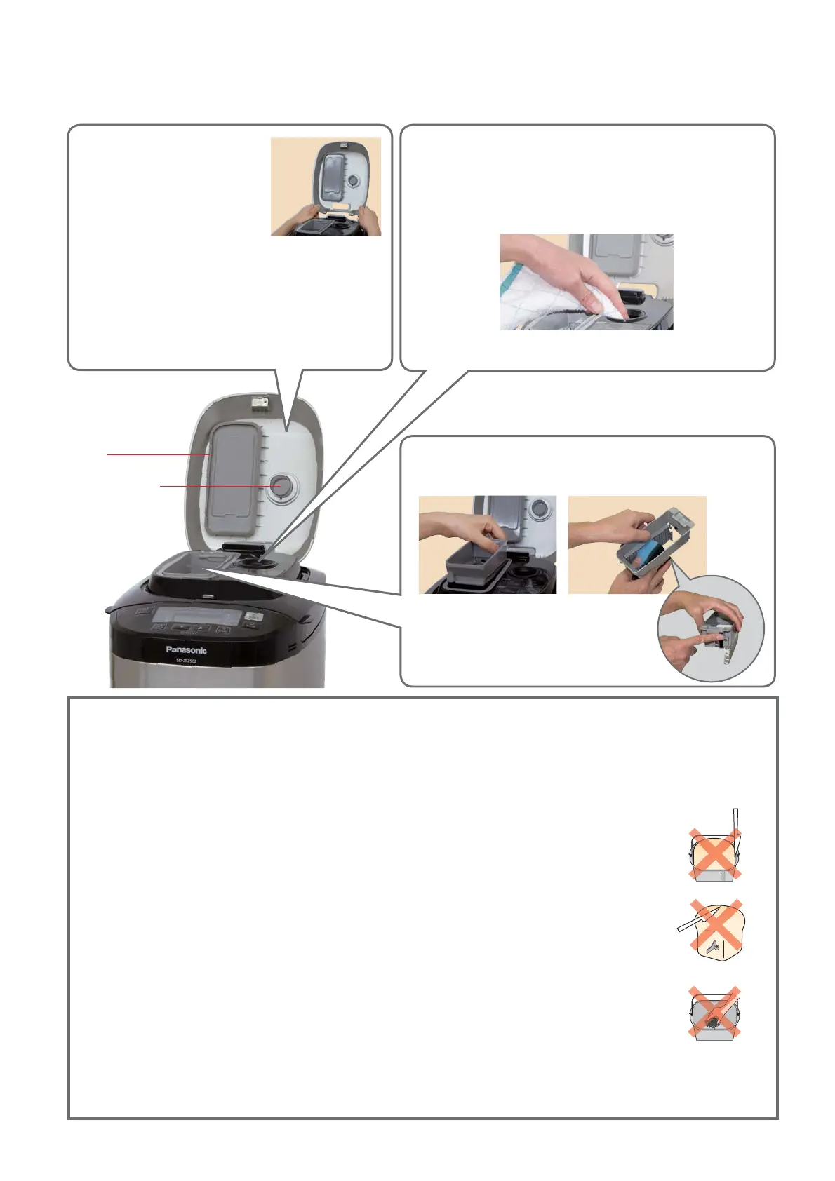 • No utilice utensilios duros como un cuchillo o un tenedor cuando extraiga el pan del recipiente del pan.
