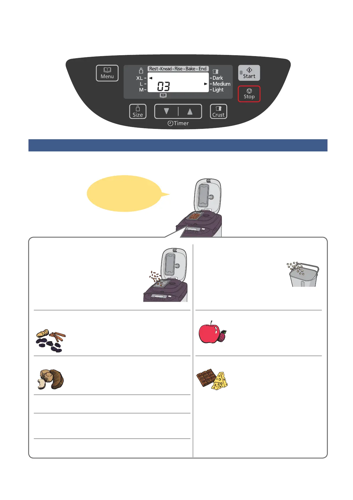 Door het menu met rozijnen te selecteren (03, 06, 14, 17, 19 of 25) kunt u uw favoriete ingrediënten door het deeg mengen om brood in