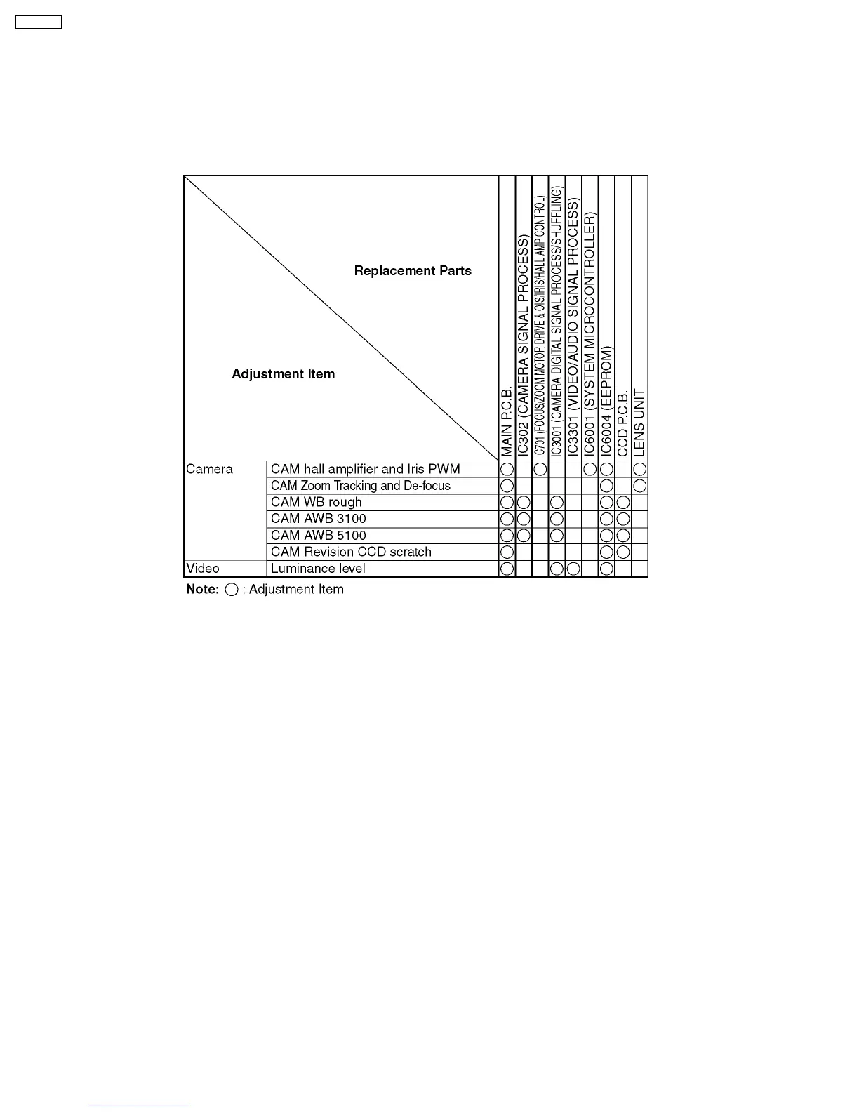 The table below shows which adjustments are necessary according to the unit parts and individual parts to be replaced. Make sure