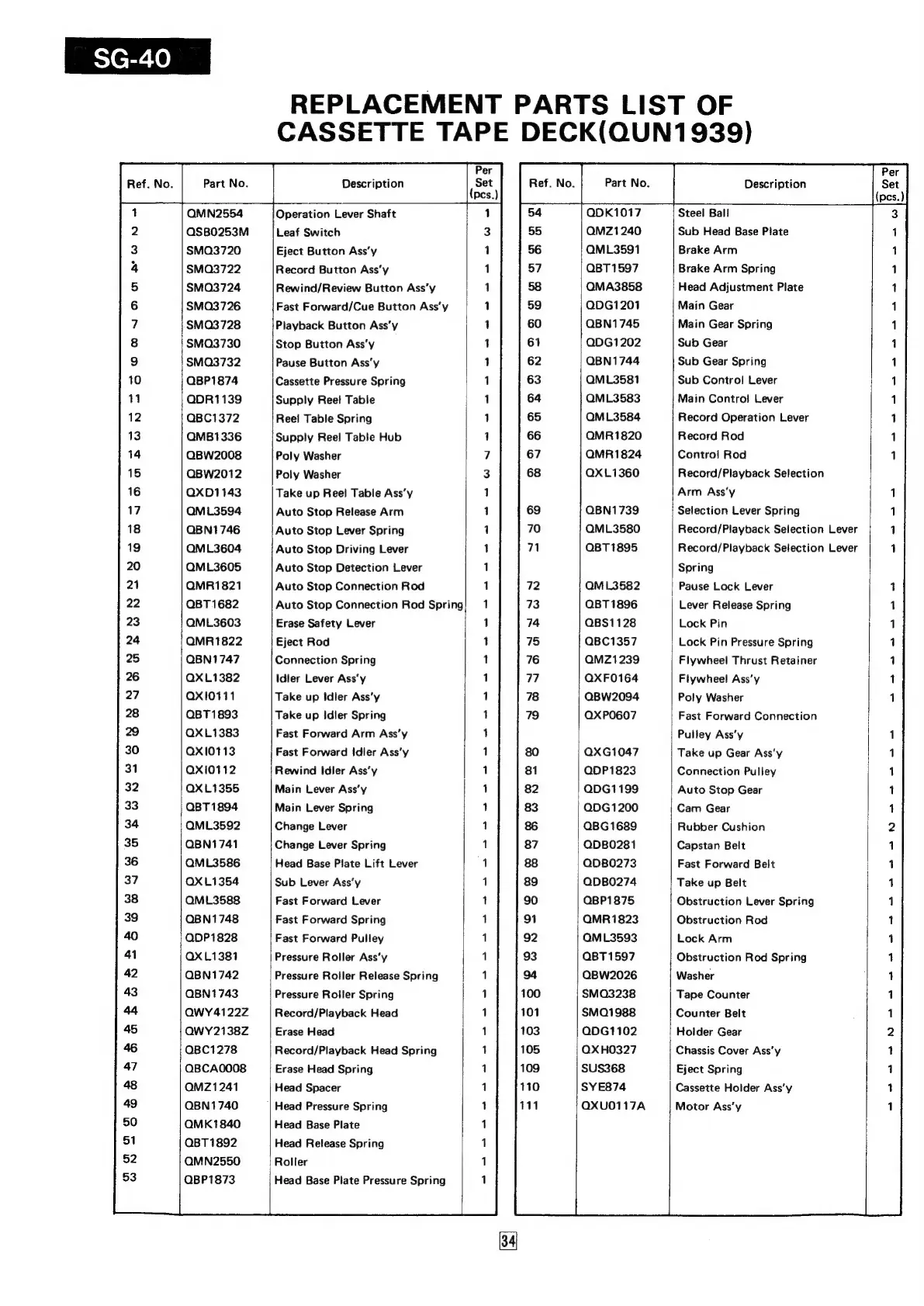 Panasonic SG-40 - Cassette Tape Deck Parts