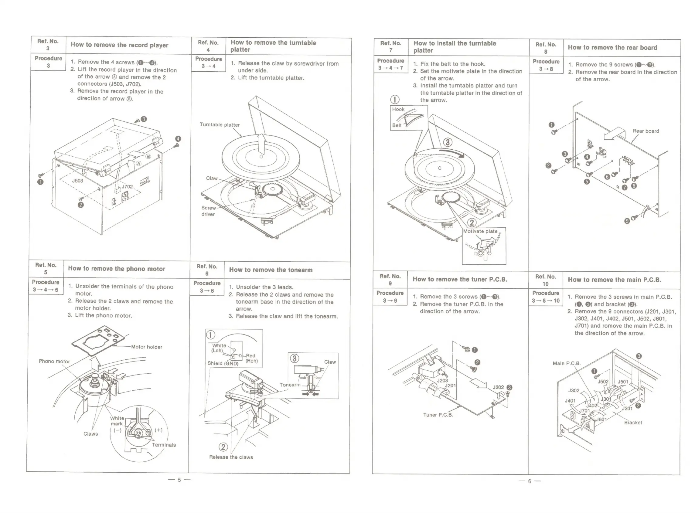 Panasonic SG-D16 - How to remove the record player; How to remove the turntable platter; How to install the turntable platter; How to remove the rear board