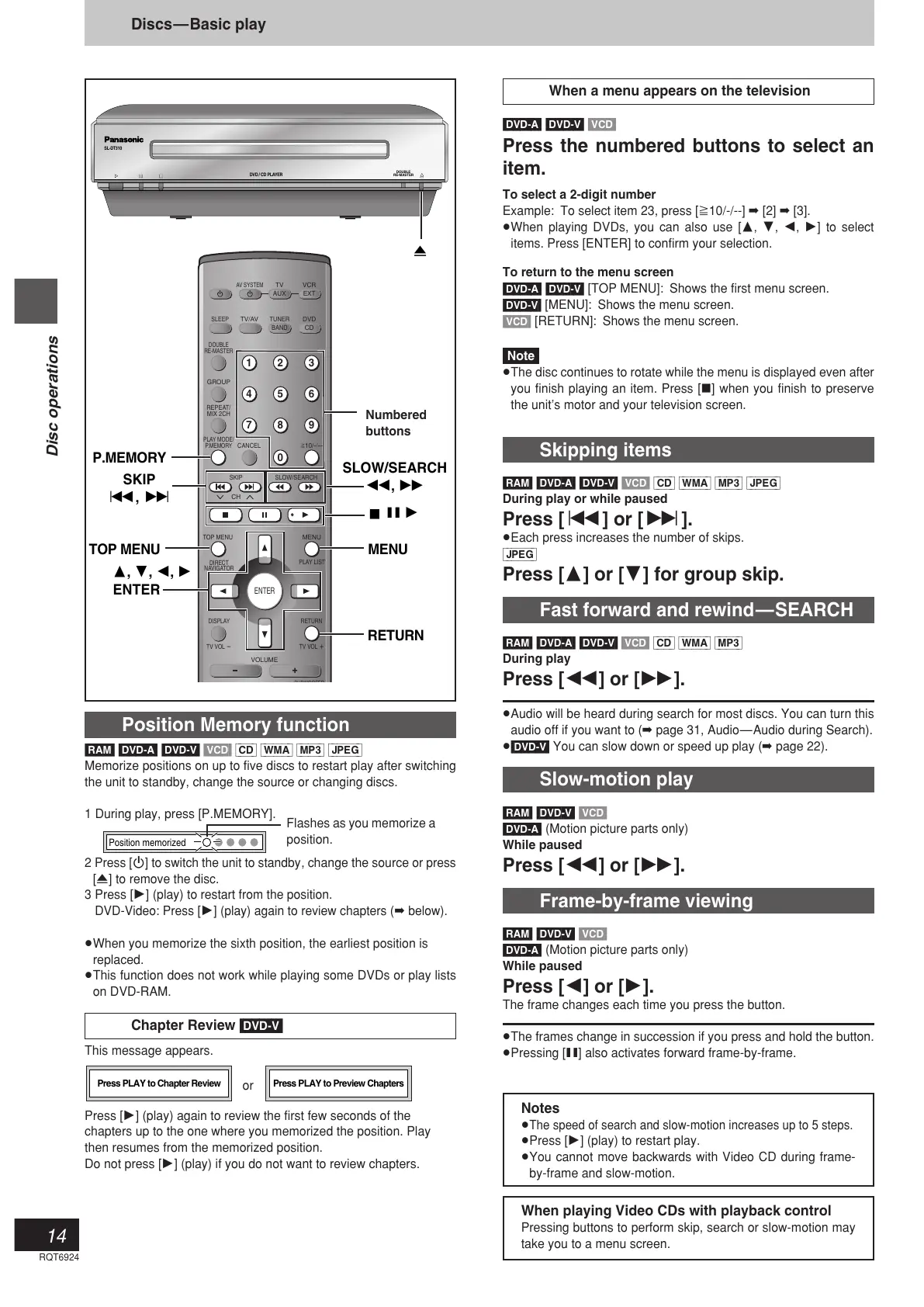 Panasonic SL-DT310 - Disc Operations: Playback Features; Menu Navigation and Search Functions