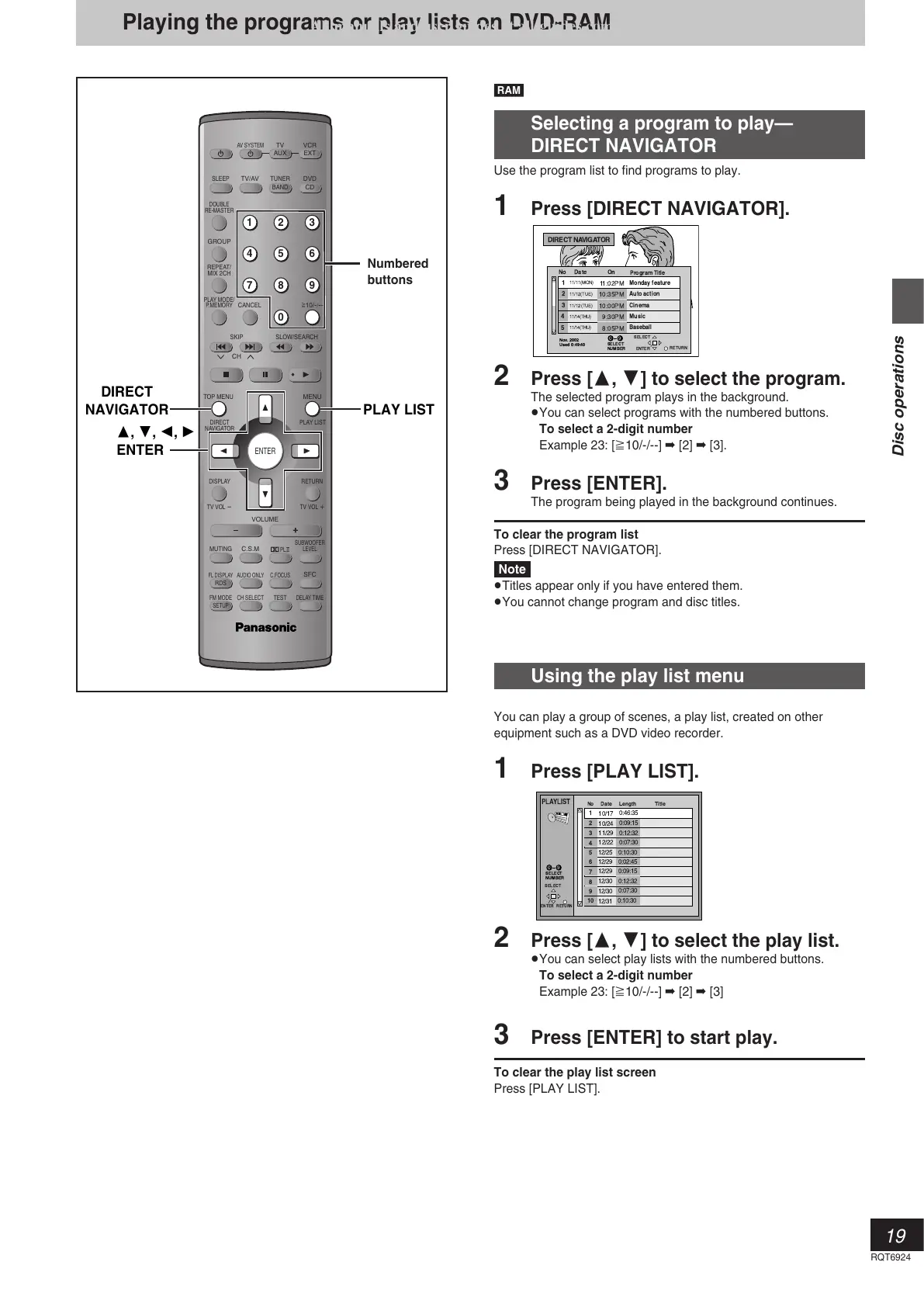 Panasonic SL-DT310 - Playing the Program or Play Lists on DVD-RAM; Selecting a Program to Play-DIRECT NAVIGATOR; Using the Play List Menu